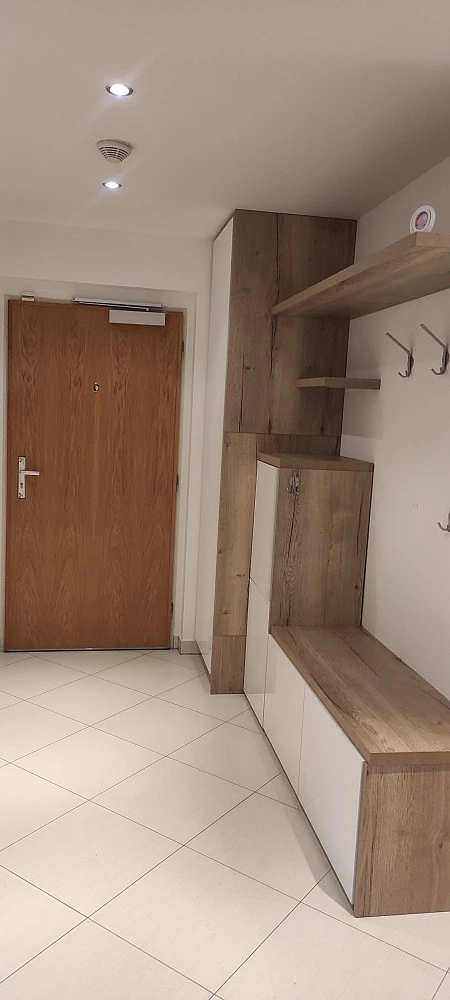 V předsíni se nachází vysoká skříň, botník, věšáky. Z předsíně je vstup do pokoje s kuchyňským koutem. Pokoj je zařízen jídelním stolem, koženou sedačkou a TV stolkem. Kuchyň je vybavená úspornými spotřebiči Electrolux a veškerým kuchyňským nádobím. Z pokoje je také vstup do zimní zahrady. Z předsíně je dále vstup na samostatné WC, do koupelny vybavené umyvadlem, vanou, pračkou a podlahovým vytápěním a dále do ložnice, která je zařízena vestavěnou skříní a velkou postelí. Z ložnice se pak dostanete na terasu a předzahrádku. Terasa je vybavena zahradním nábytkem, na předzahrádce jsou okrasné dřeviny a malé jezírko. V bytě se také nachází praktická komora s policemi.