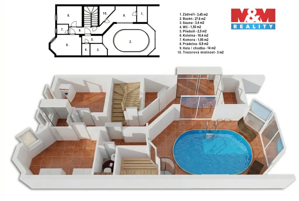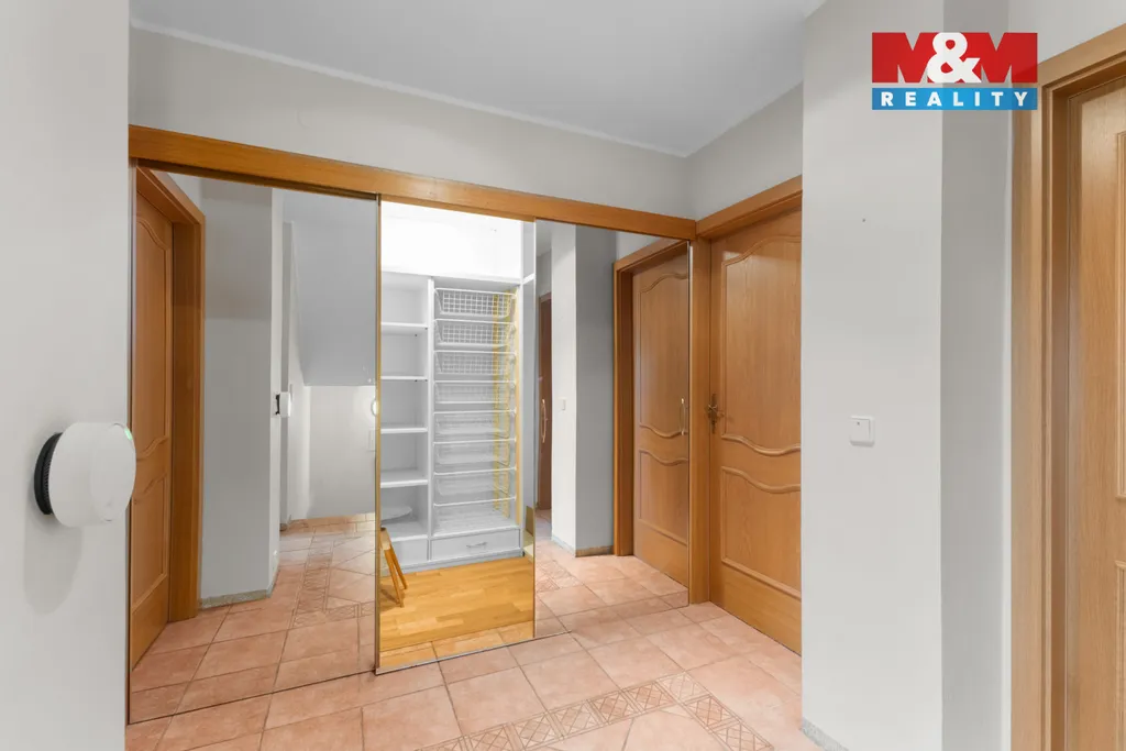 Dům je ideálně dispozičně řešen: nabízí 3 ložnice, světlou pracovnu, 2 koupelny ( jedna s vířivou vanou ), 2 samostatná WC, šatnu, terasu, prádelnu, kotelnu a úložné komory. O bezpečí vašich cenností se postará samostatná trezorovna. Exkluzivním prvkem je wellness s vnitřním bazénem a finskou saunou. Parkování zajišťuje dvojgaráž ( 38 m2 ).