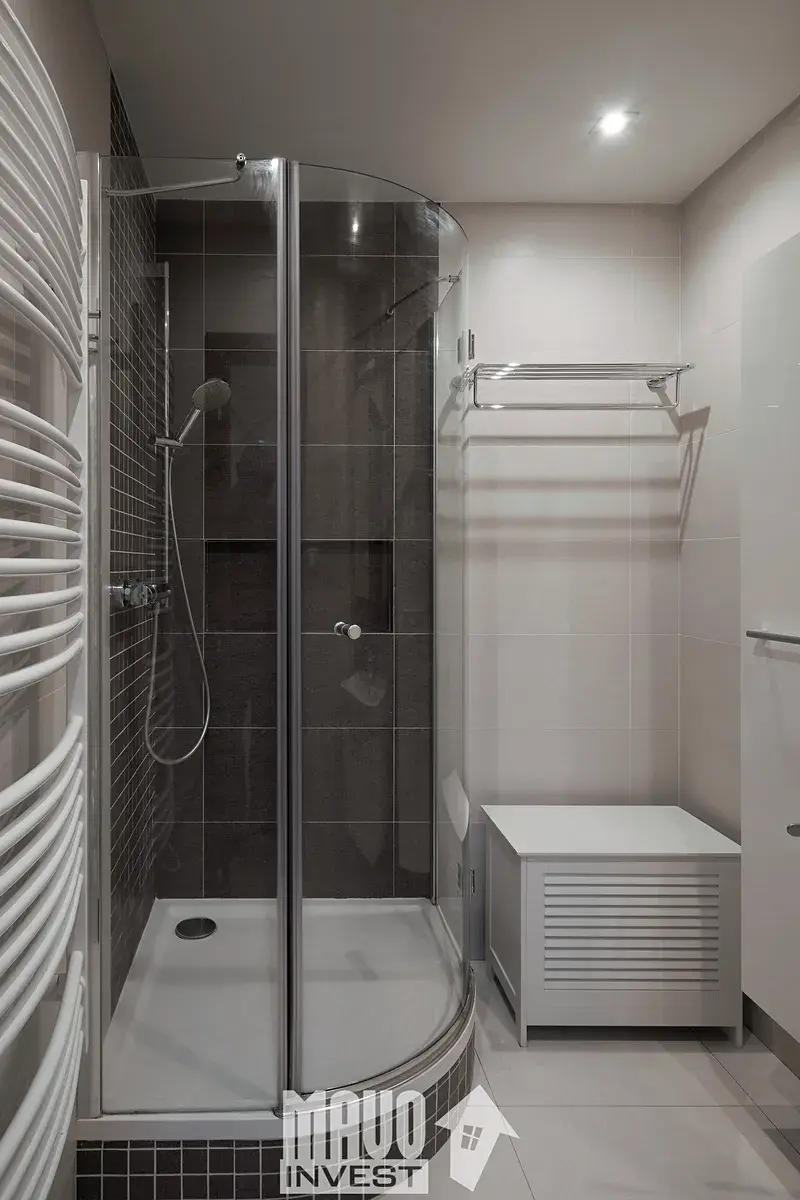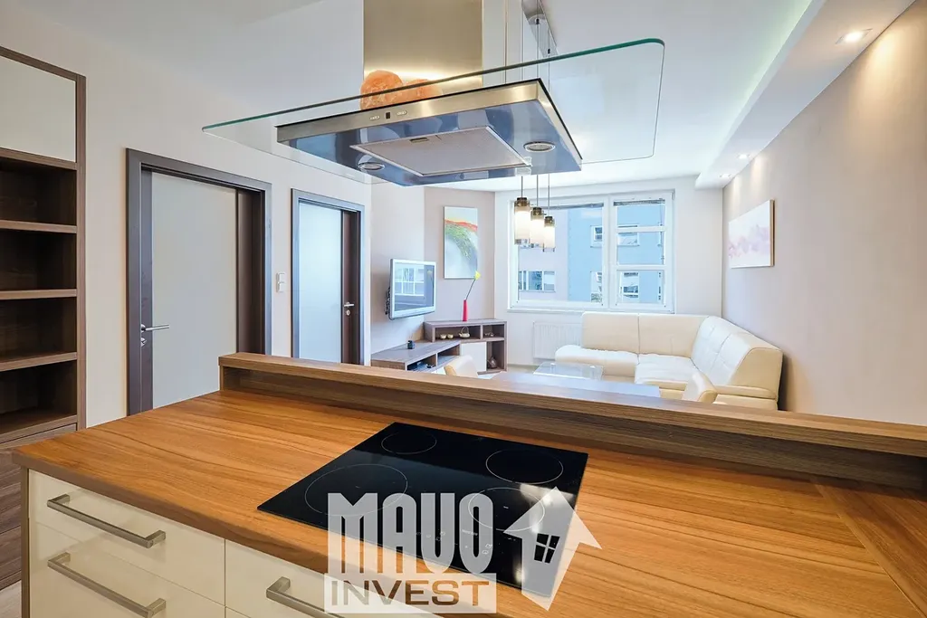 Dispozice bytu je prakticky řešená – dominantu tvoří světlý obývací pokoj s kuchyňským koutem a jídelní částí. Kuchyň je plně vybavená a díky barovému pultu přirozeně odděluje pracovní a obytnou zónu. Interiér působí čistě, moderně a je připravený k okamžitému nastěhování bez nutnosti dalších investic.