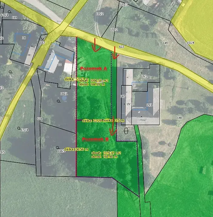 Celková výměra pozemku činí 2.595m2. Vzhledem k výměře a dostatečné šířce pozemku je možné stávající parcelu rozdělit na dva samostatné pozemky.