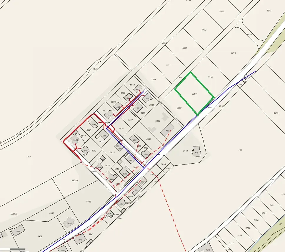 Inženýrské sítě: do 50m od pozemku přípojka obecní vody a elektřiny k stávající zástavbě. Kanalizace a plyn vzdálené cca 400 m západně od hranice pozemku
