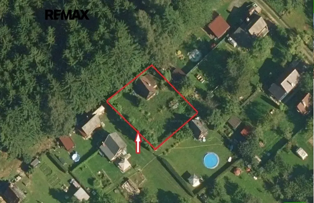 K chatě patří udržovaná oplocená zahrada téměř rovinatého terénu o výměře 404 m2.