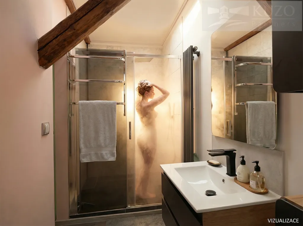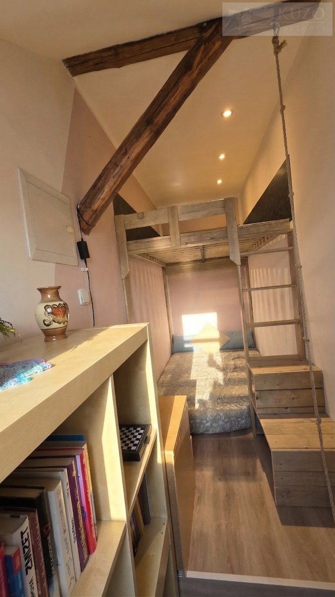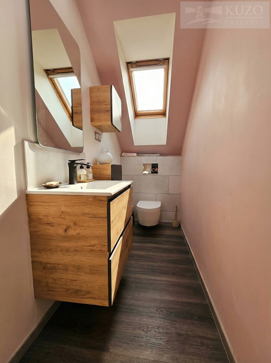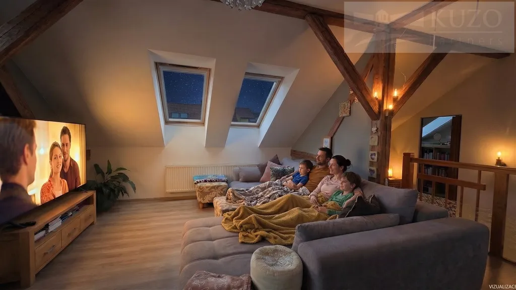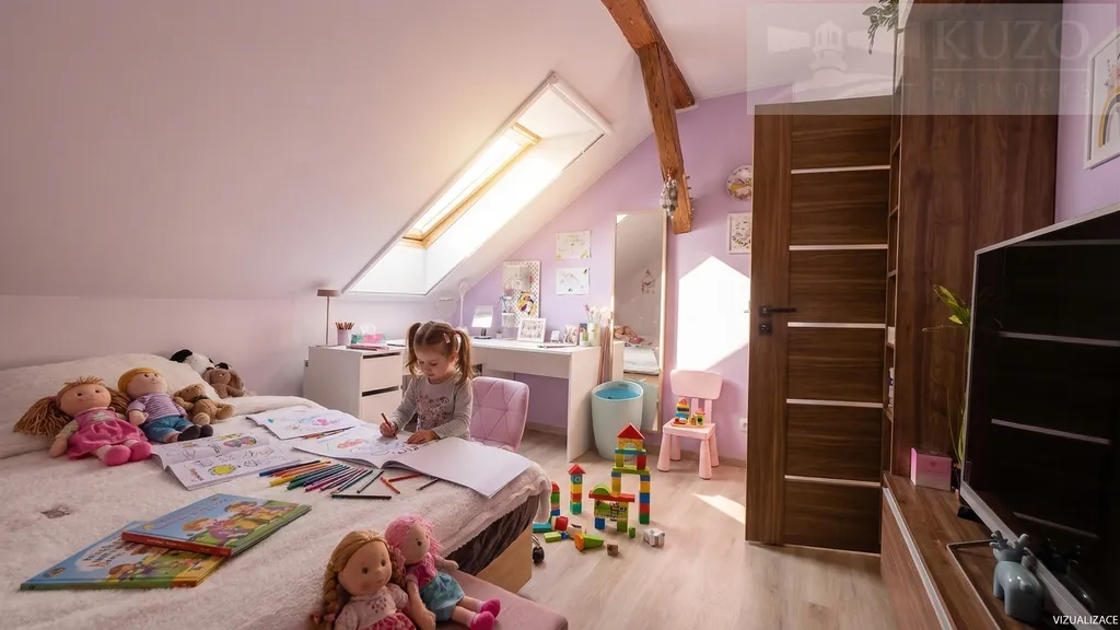 V patře najdete podkrovní obývací pokoj s přiznanými trámy, celkem 3 ložnice z toho dvě klasické ložnice (jedna s velkou šatnou) a jeden „kouzelný pokoj“. I když svými rozměry (pod 7 m²) nesplňuje tabulky pro ložnici, díky palandě je to nejoblíbenější místo pro hosty nebo dětské sny. Horní patro doplňuje druhá koupelna se sprchovým koutem a druhou toaletou.
