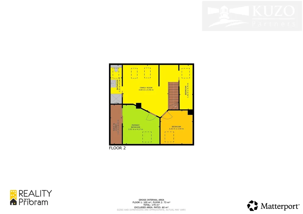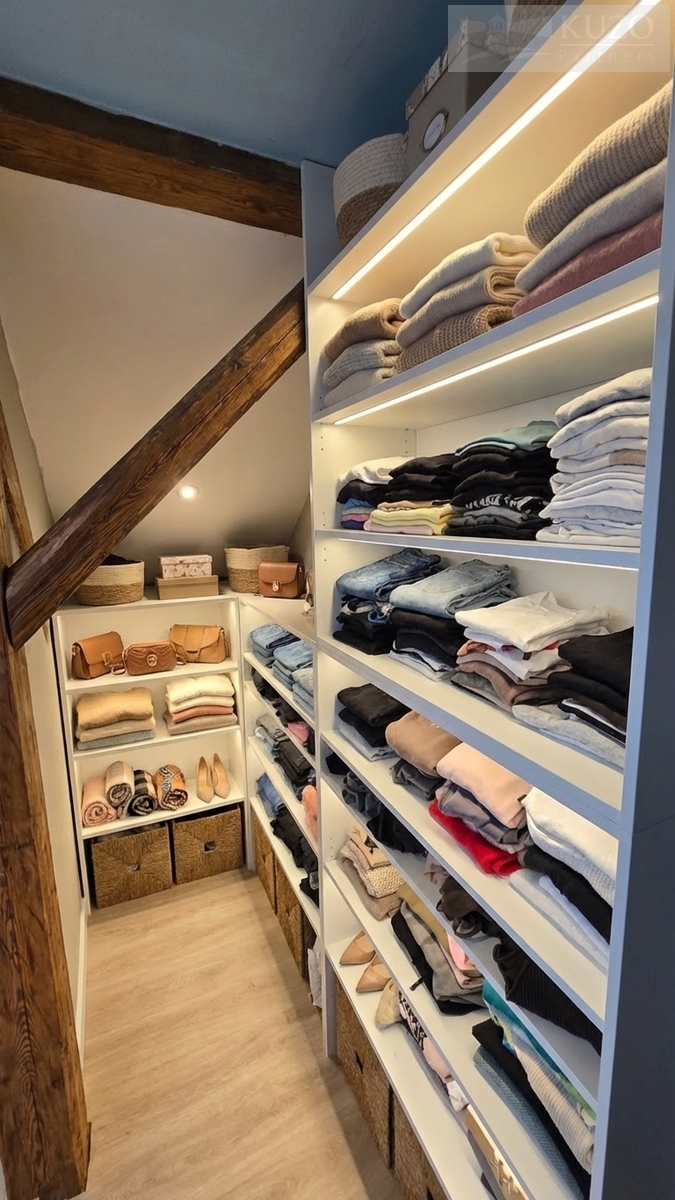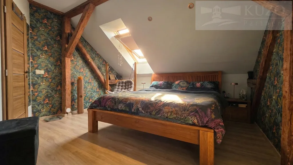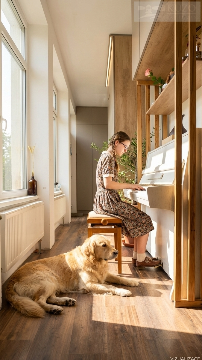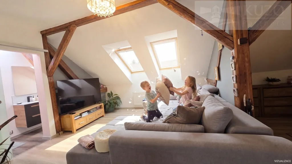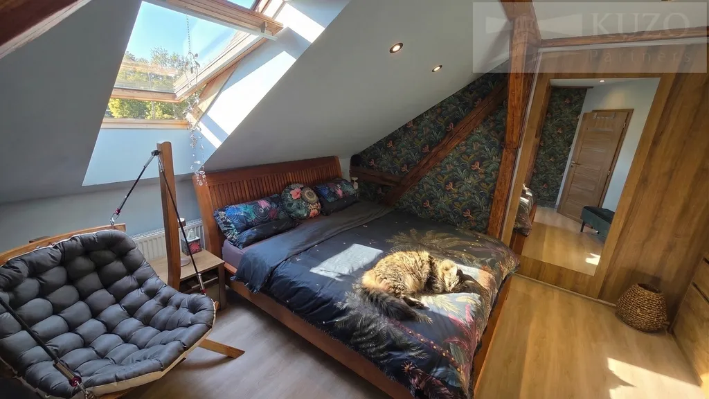 V patře najdete podkrovní obývací pokoj s přiznanými trámy, celkem 3 ložnice z toho dvě klasické ložnice (jedna s velkou šatnou) a jeden „kouzelný pokoj“. I když svými rozměry (pod 7 m²) nesplňuje tabulky pro ložnici, díky palandě je to nejoblíbenější místo pro hosty nebo dětské sny. Horní patro doplňuje druhá koupelna se sprchovým koutem a druhou toaletou.