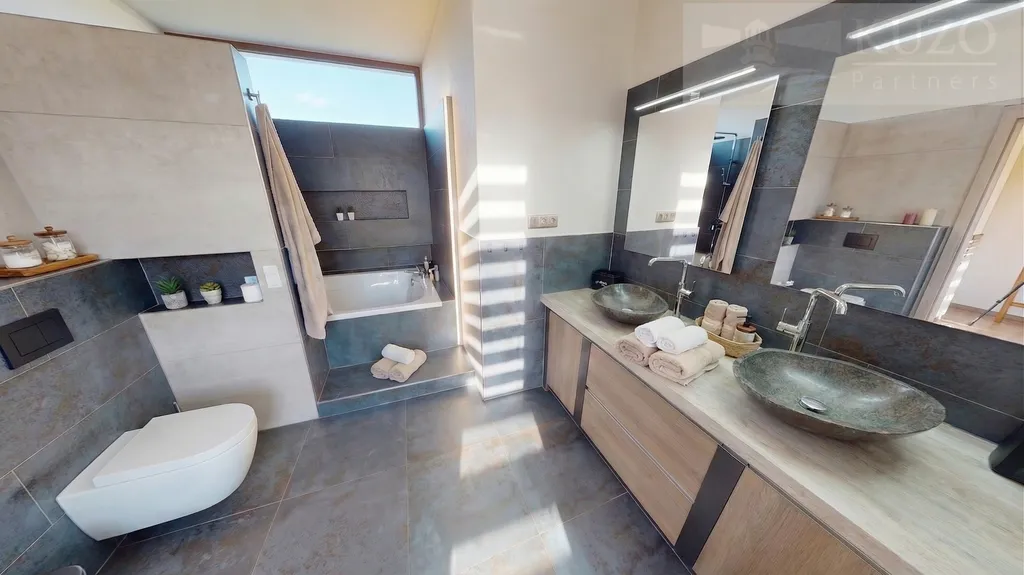 Dominantou je velkorysá kuchyně s jídelnou, kde se bude u společných večeří scházet celá rodina. Koupelna v přízemí je malým soukromým wellness – vana pro dva přímo vybízí k romantice po náročném dni. Celé přízemí doplňuje prostorná chodba a promyšlené množství úložných prostor.