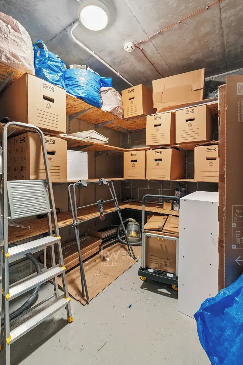 K bytu náleží také sklepní kóje (6 m²) a jedno parkovací stání (22 m²) až pro dva automobily.