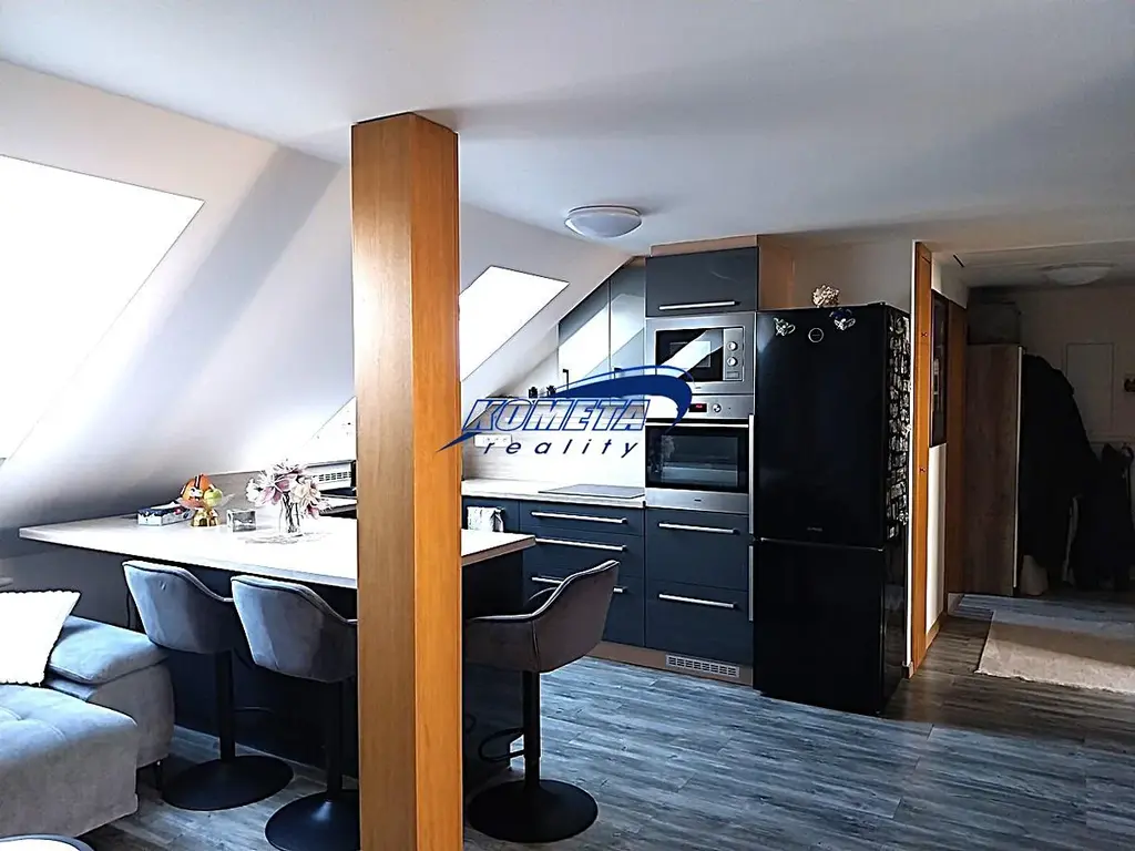Nabízíme k prodeji světlý a útulný podkrovní byt o dispozici 3+kk a celkové ploše 69m2 + sklep 16m2.