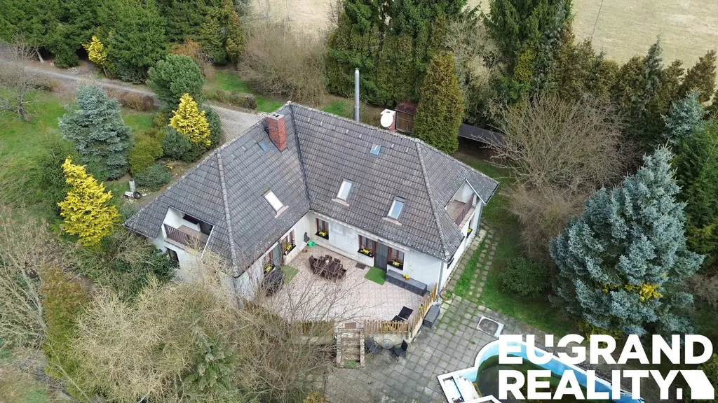 Součástí domu je terasa a balkon s krásným výhledem do okolní krajiny. Na pozemku se dále nachází venkovní bazén (15 m²), který aktuálně není funkční a vyžaduje opravu, dvě garáže a dostatek prostoru pro parkování i skladování.