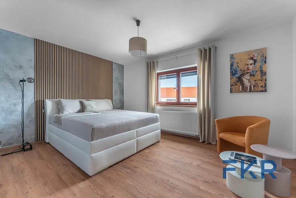 Horní podlaží tvoří klidovou část domu určenou pro odpočinek i soukromí. V patře se nacházejí tři samostatné pokoje, šatna, oddělená toaleta a velká koupelna. Přirozené denní světlo vytváří díky velkým oknům a vhodné orientaci příjemnou atmosféru v každé místnosti. Předokenní stínění přispívá k vyššímu komfortu a pravidelné dispozice pokojů usnadňují jejich praktické uspořádání.