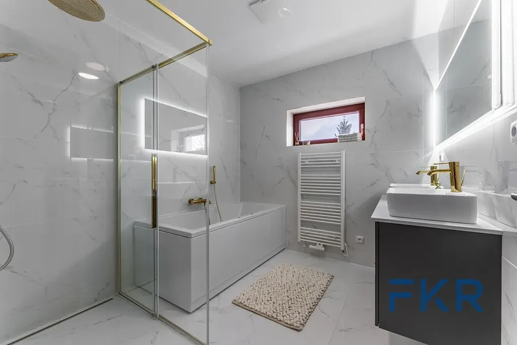 Obě koupelny jsou navrženy v jednotném, elegantním stylu s walk-in sprchou, v horním podlaží doplněnou o masážní vanu. Světlý obklad s jemným žilkováním spolu se zlatými armaturami Hansgrohe vytváří harmonický celek, který díky oknům podtrhuje i přirozené denní světlo.