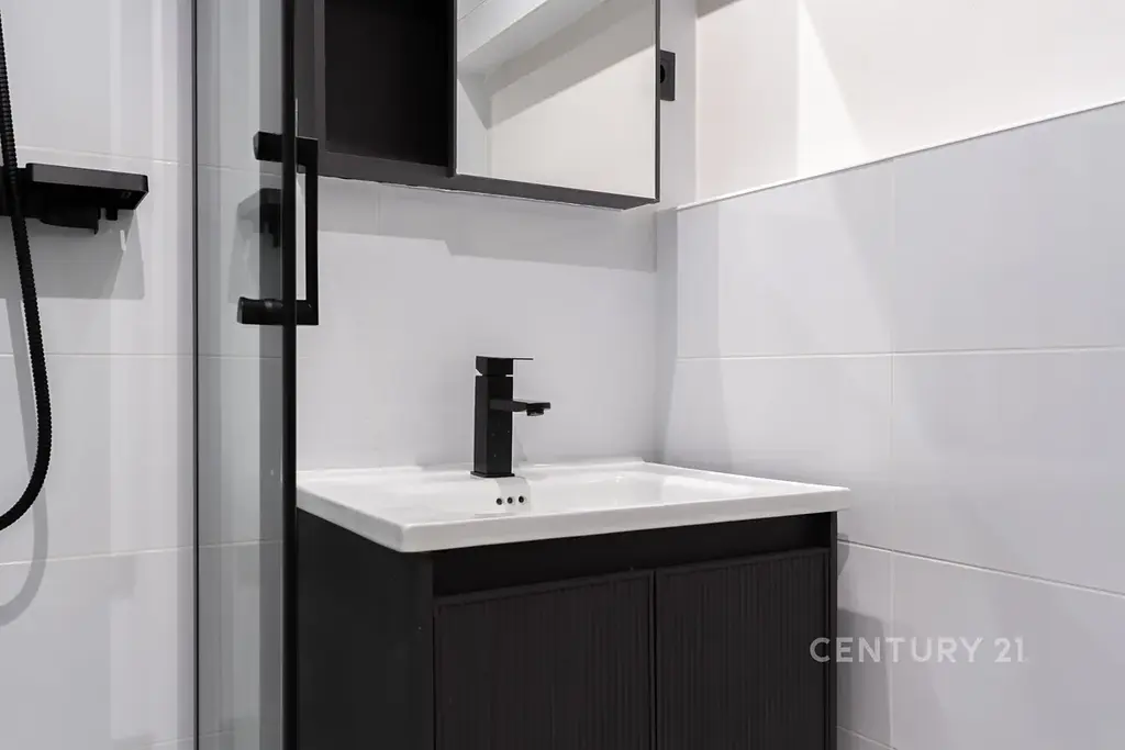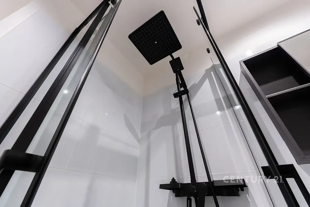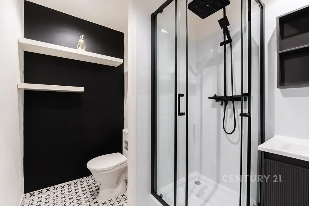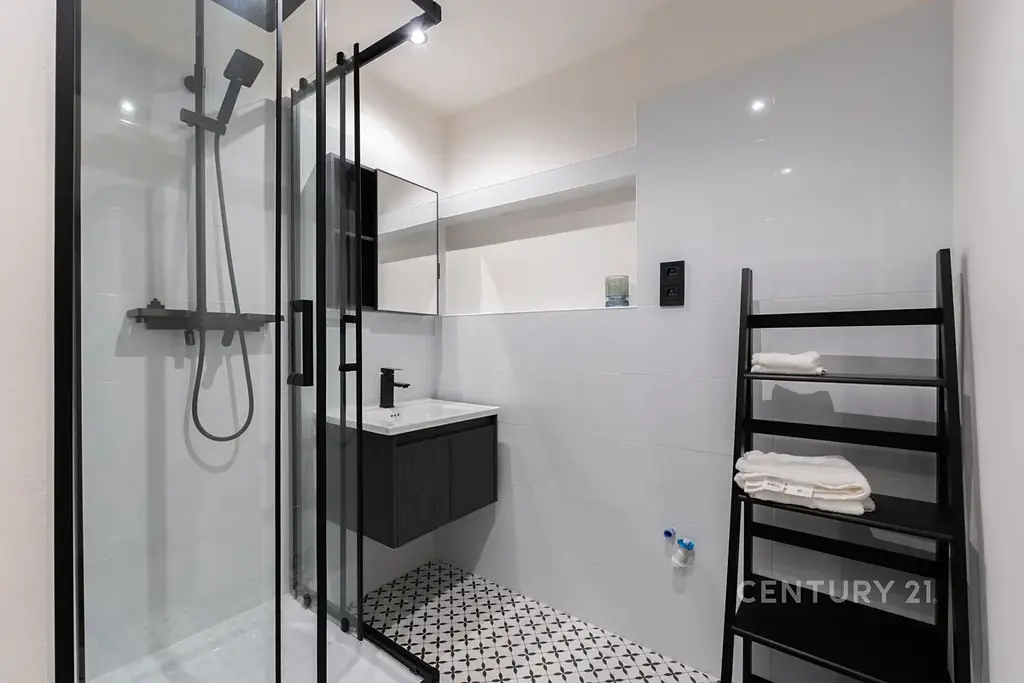 Vkusně řešenou koupelnu se sprchovým koutem, designovými černými doplňky a zásuvnými dveřmi