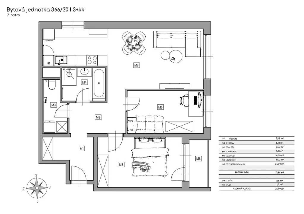 - Obývací pokoj s prostornou kuchyní na míru (27 m2)