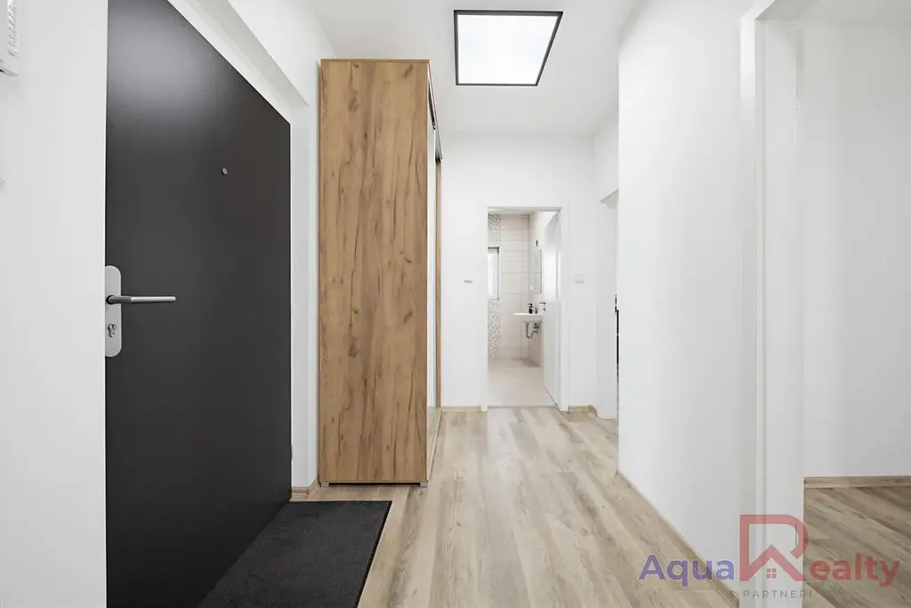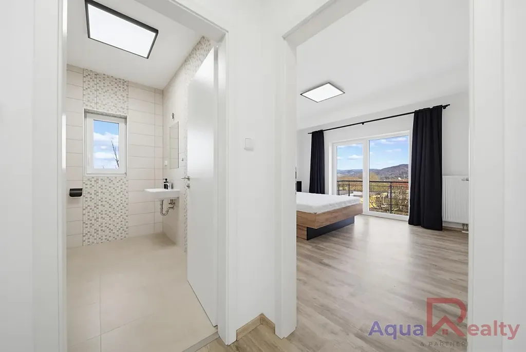 Byt dále nabízí prostornou ložnici s přímým vstupem na balkon, odkud se otevírá krásný výhled na Krušné hory a okolí Karlových Varů. Další pokoj lze využít jako dětský pokoj, pracovnu či pokoj pro hosty. Všechny místnosti jsou laděny do světlých tónů a sjednoceny kvalitní vinylovou podlahou, která je nejen estetická, ale i praktická na údržbu. Koupelna působí čistým a moderním dojmem. Velkou výhodou je také prostorná vstupní chodba, kde se nachází skříň poskytující dostatek úložného prostoru.