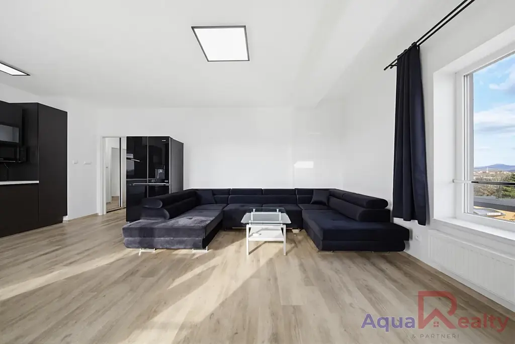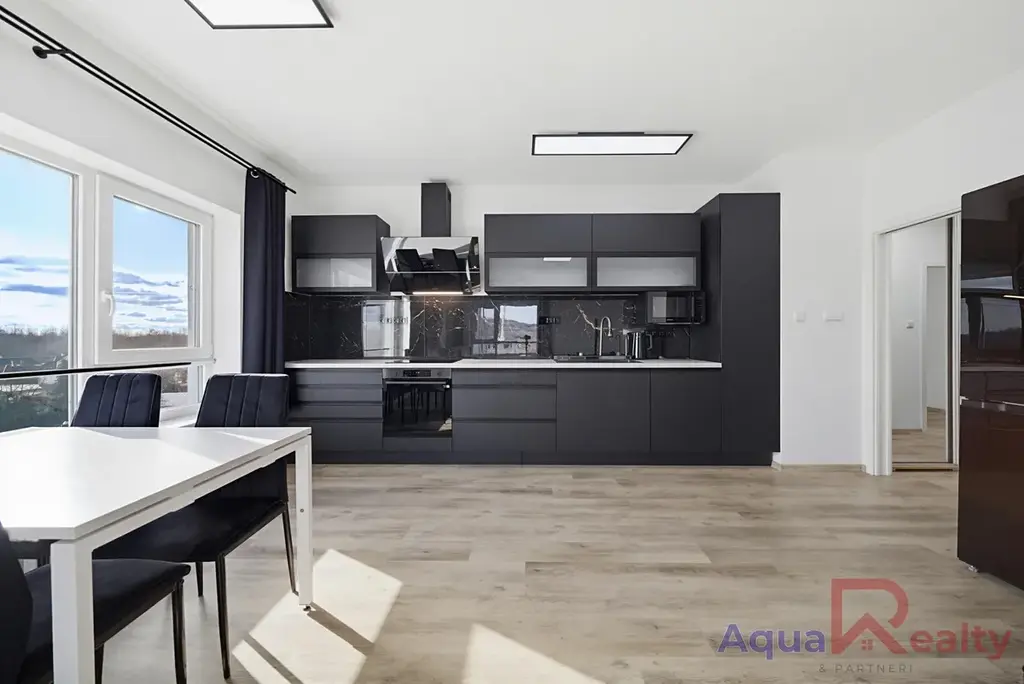 Interiér bytu působí velmi vzdušně a čistě. Dominantou je prostorný obývací pokoj propojený s moderní kuchyňskou linkou v elegantním tmavém designu, která je plně vybavena spotřebiči, včetně myčky, trouby s indukční deskou, mikrovlnné trouby, digestoří a dvoukřídlé lednice. Velká okna zajišťují dostatek denního světla a příjemnou atmosféru. Obývací část je doplněna o pohodlnou sedací soupravu, konferenční stolek a jídelní kout se stolem a židlemi.