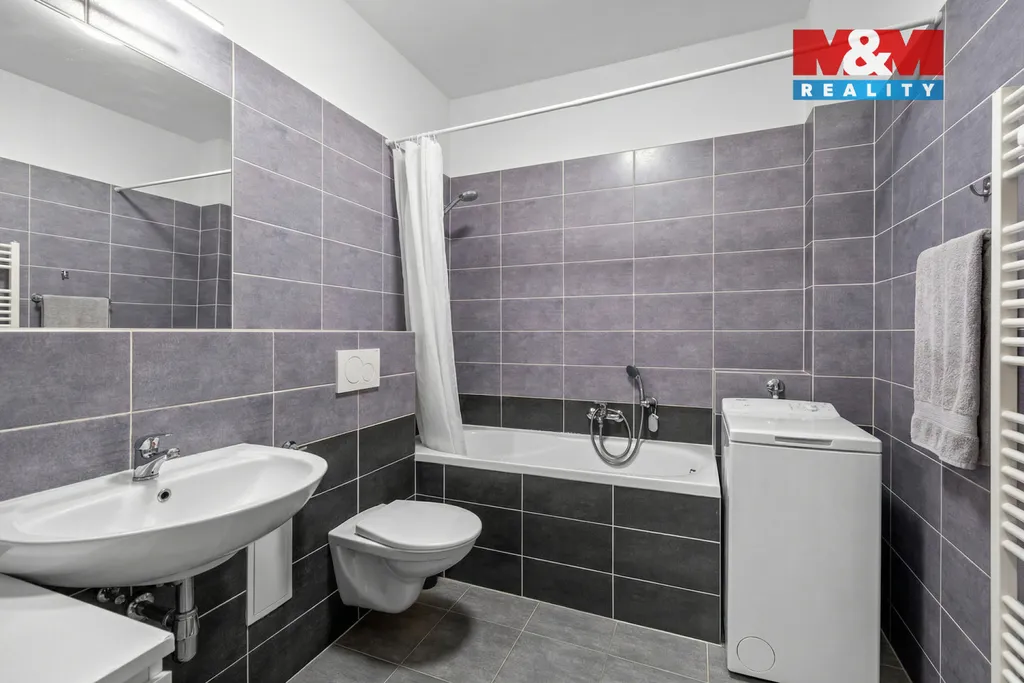 Součástí bytu je kuchyňská linka a také plně zařízená koupelna.