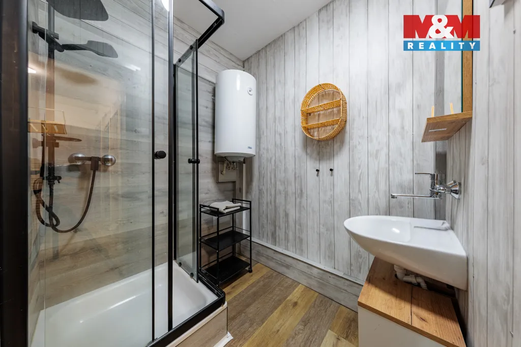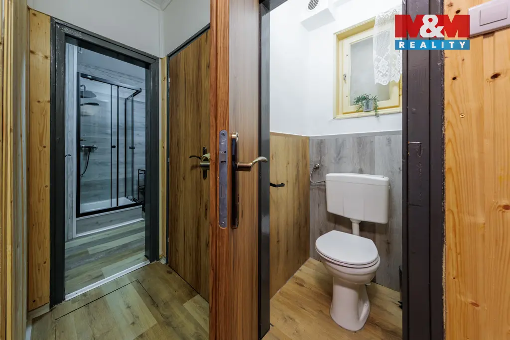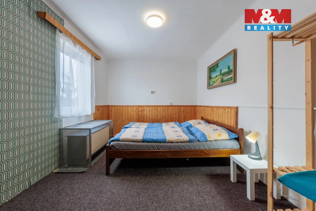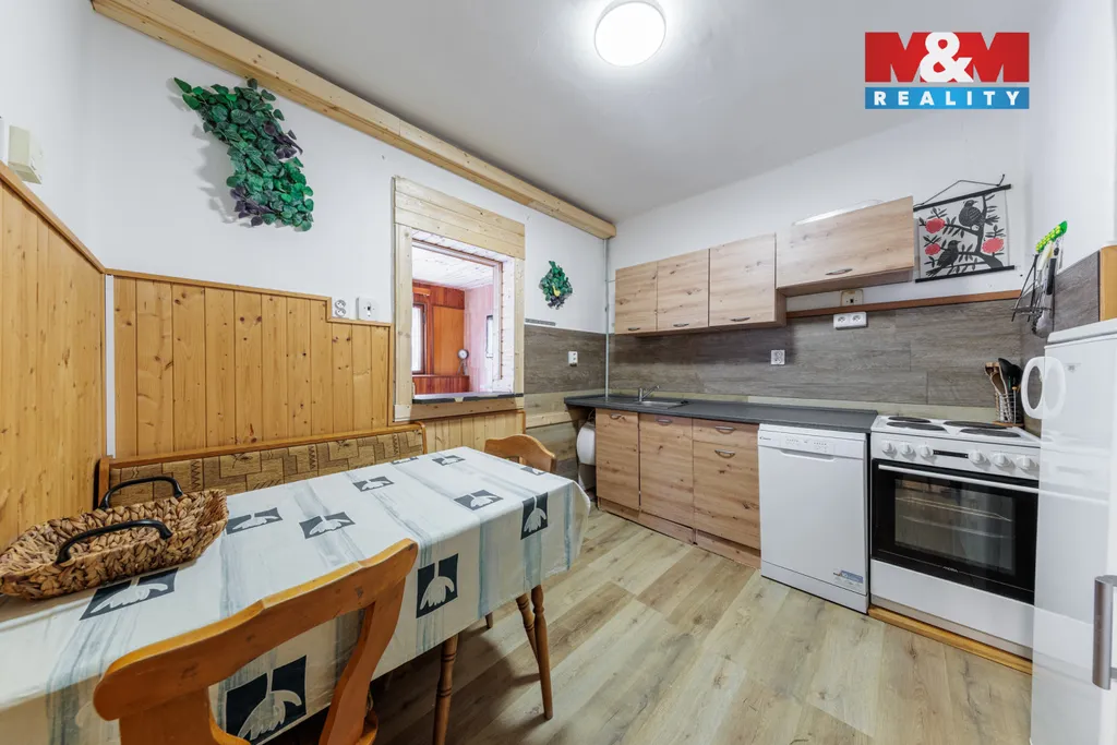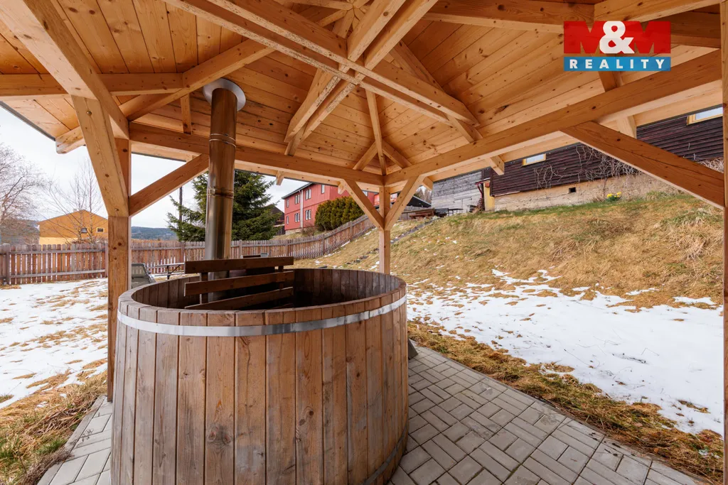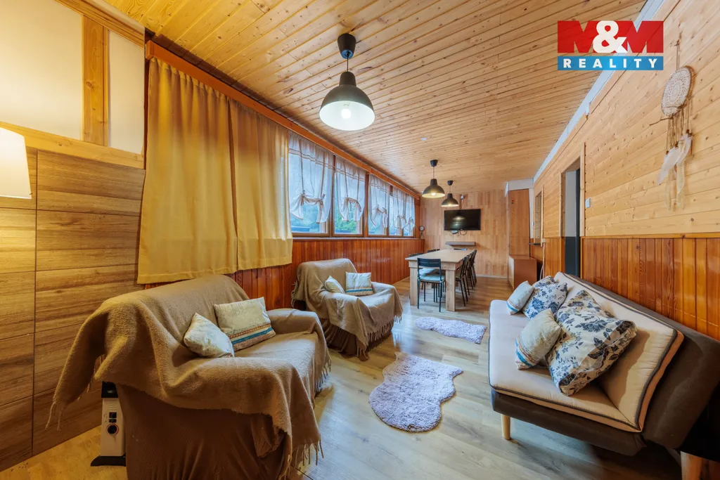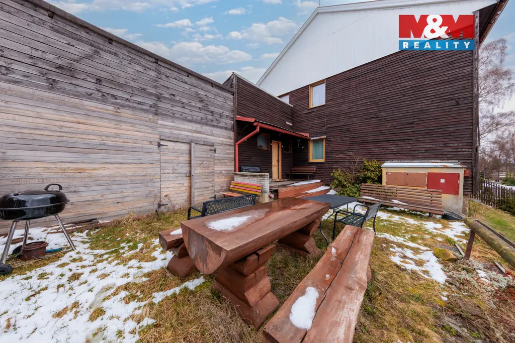 Prodáme dvougenerační dům se zahradou v Mariánské u Jáchymova. V přízemí se nachází byt 4+1 s koupelnou a dvěma WC, chodba a sauna s východem na terasu, v patře byt 3+1 s koupelnou a dvěma WC. Vytápění zajišťují akumulační kamna umístěná v každém pokoji, ohřev vody bojlery. Zahrada je částečně svažitá, na rovných částech je posezení s grilem vedle terasy a zastřešený koupací sud s ohřevem na tuhá paliva. Pro pohodlný život nabízí dům vše včetně velkého obytného prostoru pro dvě rodiny, parkovacího přístřešku, domácího wellness a krásného výhledu do okolí. Dům byl úspěšně provozován jako horská chalupa k pronájmu pro lyžaře, cyklisty a milovníky přírody. Uspořádání místností umožňuje bydlení i pronájem zároveň, nákupem této nemovitosti tedy získáte bydlení i vynikající investici. Z Mariánské se rychle dostanete do skiareálů na Plešivci a Klínovci nebo do lázní v Jáchymově. Pokud vás nabídka zaujala, neváhejte nás kontaktovat a domluvit si prohlídku.