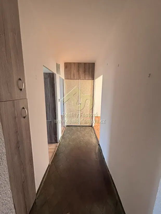 - Vstupem do bytu vejdeme do dlouhé vstupní chodby, hned napravo se nachází jádro se samostatnou koupelnou s vanou a samostatná toaleta. Z druhé strany jádra je prostorná kuchyně s kuch.linkou a potravinou skříní.