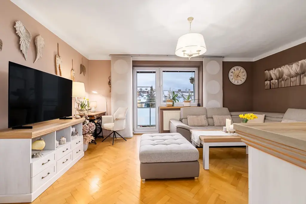 Dispozičně velmi hezky řešený byt 3 + 1 o velikosti 70 m2 prošel velmi stylovou rekonstrukcí. Díky tomu může nabídnout velice nadstandardně řešené prostory koupelny, praktickou komoru, opravdu velké pokoje a tolik žádaný balkon do vnitrobloku domu ( 4m2 ). A nejen to. Obývací pokoj ( 21m2 ) s balkonem na jižní stranu poskytne dostatek prostoru i větší rodině. Pokojíček pro děti je situován v zadní části bytu za kuchyní a lze ho propojit i s ložnicí. Současným majitelům byt vyhovoval v tomto uspořádání, Vy už si můžete zvolit jiné.