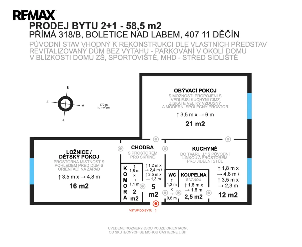 nabízíme Vám k prodeji bytovou jednotku v osobním vlastnictví s dispozicí 2+1 s celkovou užitnou plochou 58,5 m2, nacházející se v 1. patře panelového domu bez výtahu v ul. Přímá 318/b v Děčíně, městské části Boletice n. Labem. K bytu náleží komora v mezipatře a dvě sklepní kóje.
