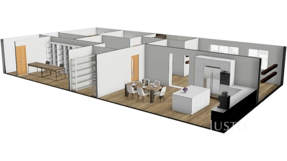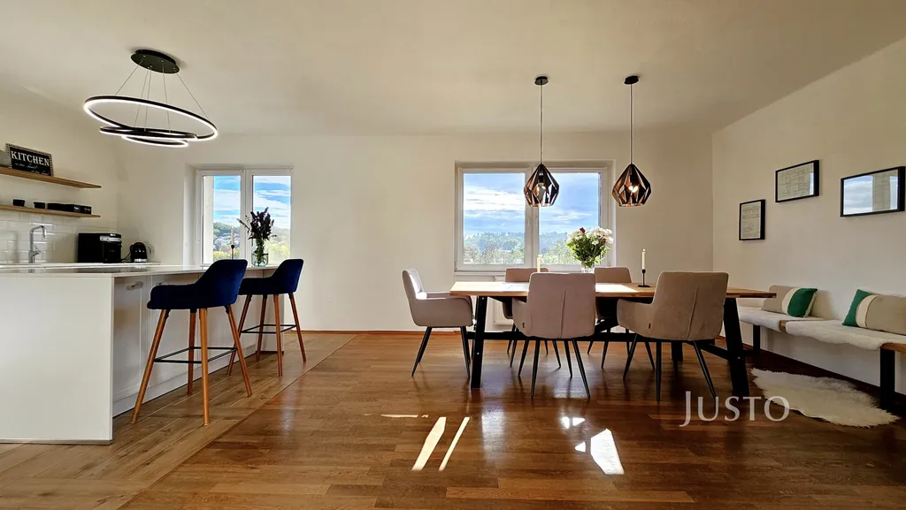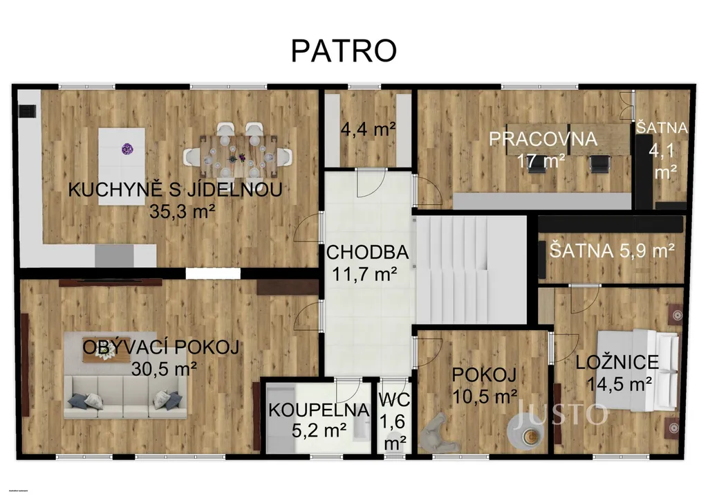 Dřevěným schodištěm se dostanete do 2. patra, kde najdete moderní kuchyň ve stylu Provence s ostrůvkem, velkým jídelním stolem a praktickou kuchyňskou linkou s dostatkem jak pracovního, tak úložného prostoru. Je to místo, kde bude celá rodina pohromadě, ale každý bude mít dost místa pro svoje aktivity. Na kuchyň navazuje obývací pokoj s výhledem do zahrady – ideální prostor pro lenošení.
