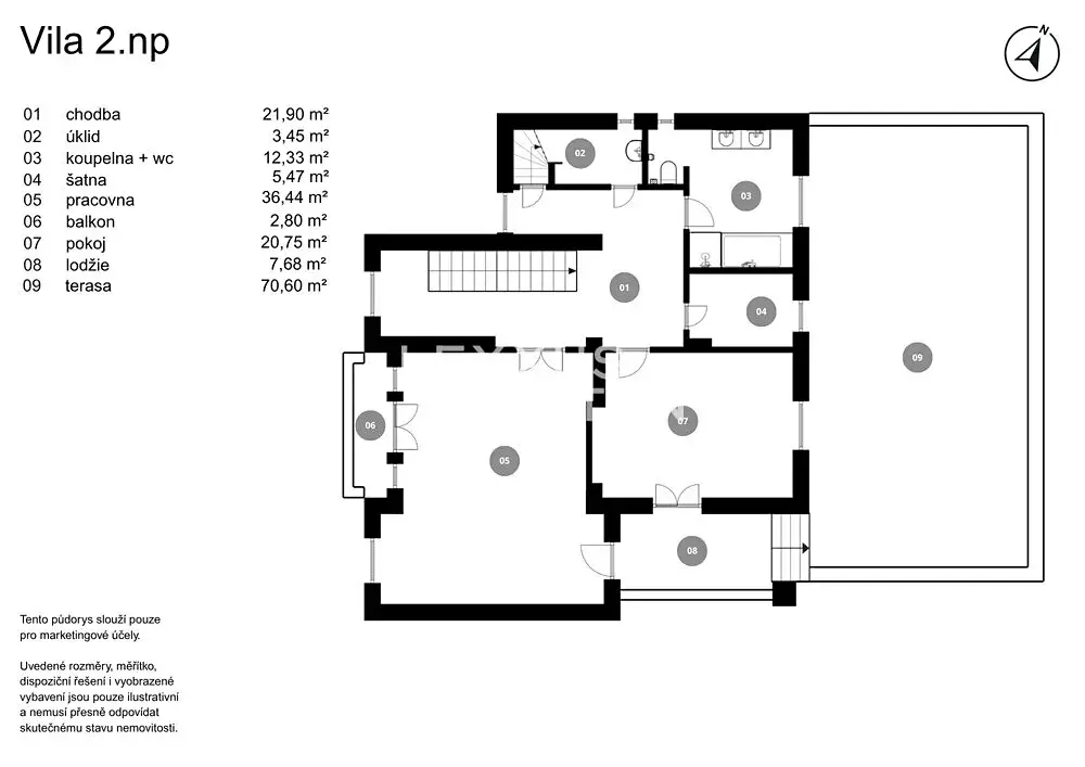 Podkroví tvoří otevřený obytný prostor s viditelnými krovy a plnohodnotnou technickou místností.