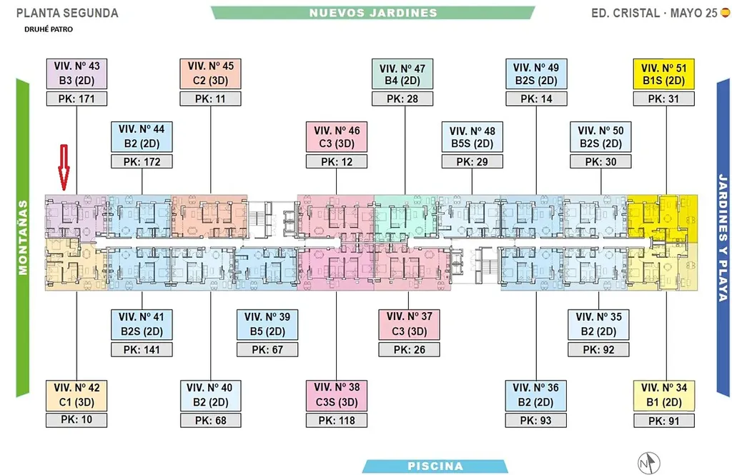 Apartmán s označením SPVCR1_43 se nachází ve druhém patře. Jde dvouložnicový apartmán se dvěma koupelnami, kuchyňským koutem, obývacím pokojem a terasou 25 m2. Užitné plocha je 63 m2, celková plocha včetně terasy 81 m2. K apartmánu náleží parkovací stání číslo 171 v podzemních garážích.