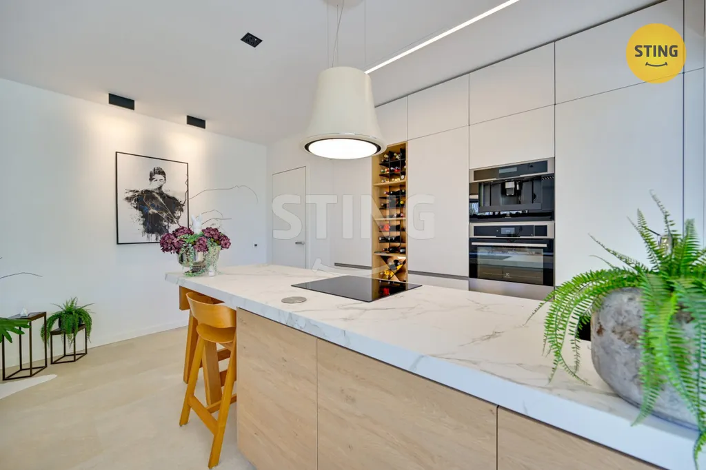 Dispozice domu je navržena s důrazem na komfort a praktičnost. Kromě tří obytných místností nabízí také dvě další místnosti vhodné například jako pracovna či sklad. Interiér je řešen designově a funkčně, s kvalitními materiály a vybavením na míru. Kuchyňská linka značky Sykora je doplněna vestavěnými spotřebiči značek Electrolux a AEG, včetně parní trouby, vestavěného kávovaru, myčky, závěsné digestoře ELICA AUDREY a lednice. Pracovní deska je z umělého kamene Dekton o tloušťce 6 cm se zapuštěným granitovým dřezem. V obývacím prostoru jsou instalována krbová kamna Vulsini Storch s přisáváním vzduchu a elektrickou regulací. Koupelna je vybavena prvky značek Solitér, Hansgrohe, Puravida a Alessi, včetně walk-in sprchy a toalety TECE se sprškou a odsáváním zápachu. Interiér doplňují bezfalcové dveře Sapeli Elegant s kováním Tupai Dedos, designové osvětlení s dálkovým ovládáním ENIKA, dotykové vypínače ROON a vestavěné skříně na míru.