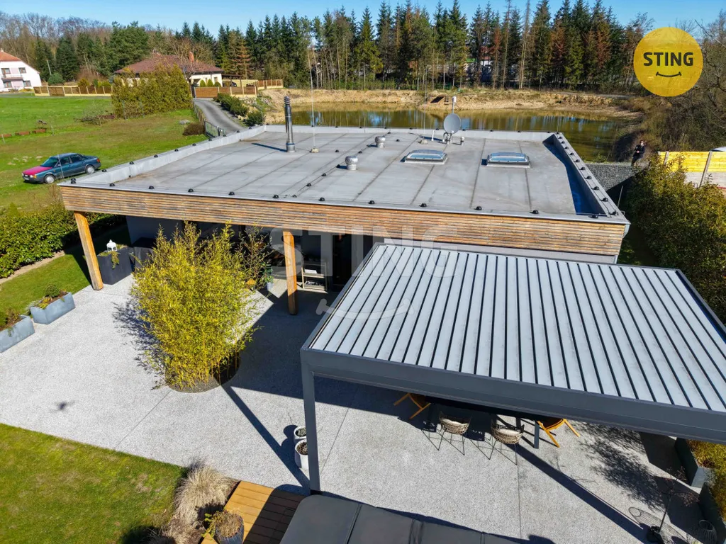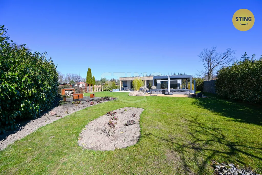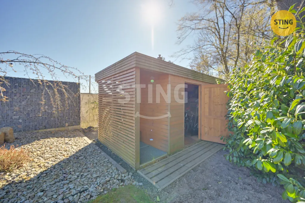 Exteriér domu nabízí rozsáhlou zahradu s maximálním soukromím, zatravněnou plochou a pečlivě navrženou zelení včetně bambusu podle návrhu zahradního architekta. Součástí je bioklimatická hliníková pergola o velikosti 24 m² s otočnými lamelami a elektrickými roletami se senzory proti dešti a větru, která umožňuje komfortní relaxaci za každého počasí. K dispozici je také vyhřívaný bazén s vířivkou Canadian Spa Mollus XXL o rozměrech 10 m² s pískovou filtrací a osvětlením. Terasa kolem bazénu je z materiálu Woodplastic a Terafest premium, doplněná o betonové a kamenné povrchy Piedra. Pro parkování slouží kryté stání pro dvě vozidla, pozemek je oplocen gabionovým plotem s elektrickou bránou a videotelefonem. Na zahradě se nachází také dřevník Korten, ohniště a zahradní domek o velikosti 14 m² s regálovým systémem.