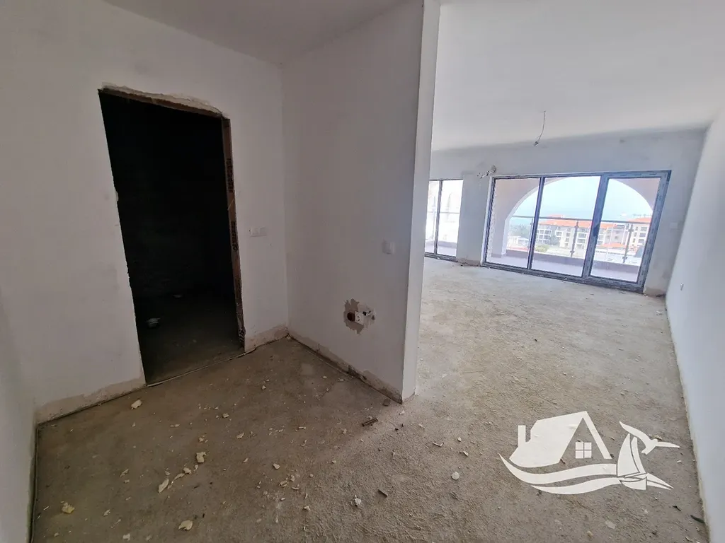 Apartmán o celkové ploše 61 - m² a čisté obytné ploše 50 - m² se nachází ve třetím podlaží a nabízí prakticky řešený prostor s možností další úpravy. Dispozice je otevřená a vzdušná, přesto umožňuje oddělit spací část a vytvořit tak komfortní 2+kk. Vstupní chodba vede do hlavního obytného prostoru s kuchyní, který přirozeně spojuje každodenní život s odpočinkem. Balkon s výhledem na moře dodává bytu lehkost a pocit propojení s okolím.