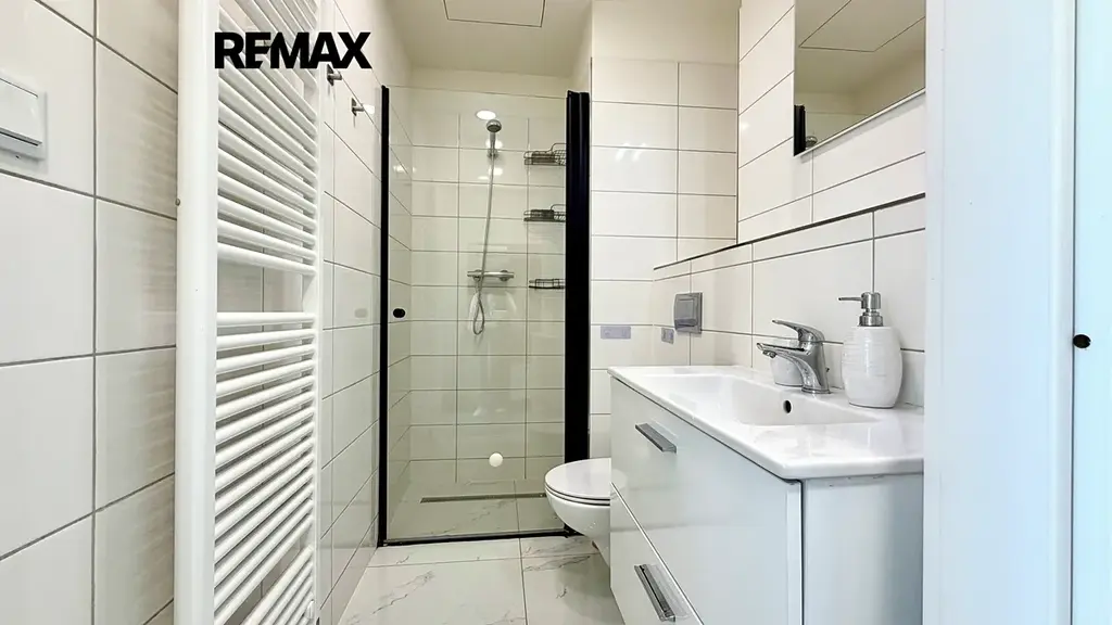 Koupelna je vybavena sprchovým koutem, umyvadlem se zrcadlem a moderními obklady.