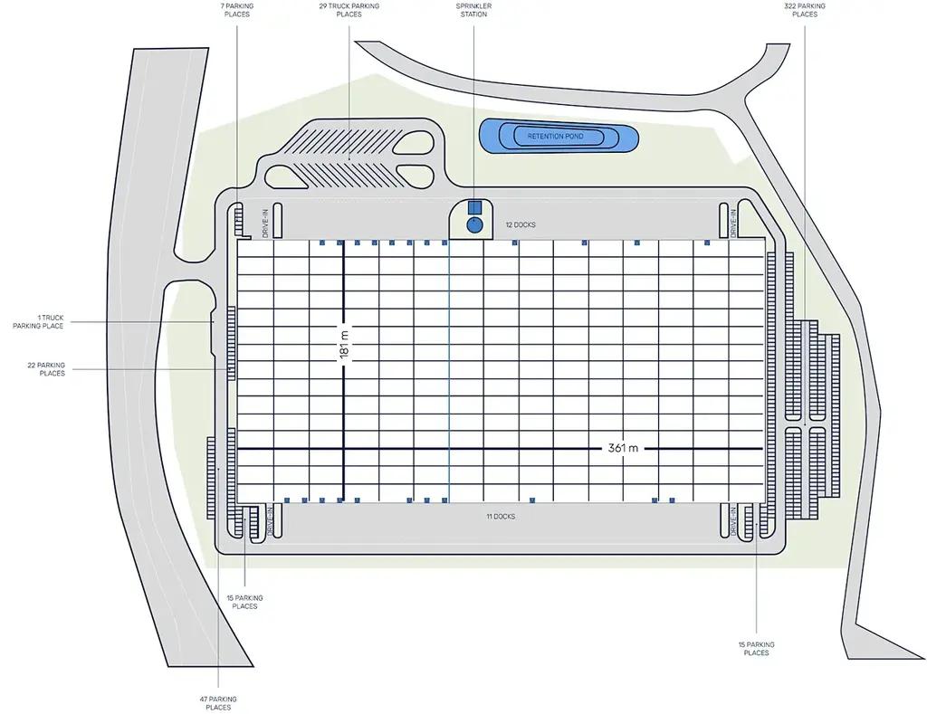 Celková plocha areálu činí téměř 38 800 m² a je připravena přizpůsobit se potřebám jednotlivých nájemců. Skladové jednotky lze rozdělit na plochy od 2 000 m², 5 000 m² nebo 10 000 m², kanceláře pak navrhnout přesně podle požadavků budoucího uživatele. Areál může být k dispozici do 12 měsíců od podpisu nájemní smlouvy.