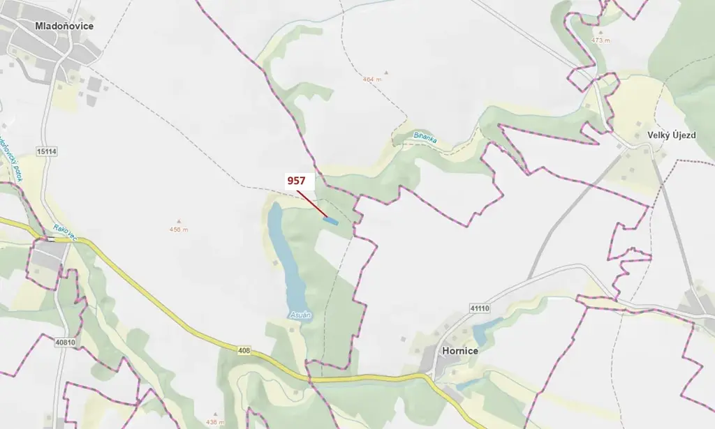 Lesní pozemek o výměře 2344 m2, parcelní číslo 957, podíl 1/1, katastrální území Mladoňovice na Moravě, obec Mladoňovice, obec s rozšířenou působností Moravské Budějovice, okres Třebíč, Kraj Vysočina.