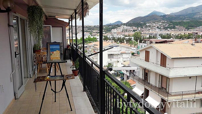 Dům, ve kterém se byt nachází, je v krásné rezidenční čtvrti, jedné z nejhezčích ve Scalea, na Via Michelangelo. Ze dvou balkonů ve čtvrtém patře, je nádherný výhled na hory a moře. V bytě jsou 3 ložnice, postele a další nábytek. Plně vybavená kuchyň s myčkou a kuchyňskými spotřebiči, je velkou výhodou. K moři dojdete klidnou ulicí během 3 minut. Poblíž domu jsou kavárny, restaurace a obchody. V domě není výtah.