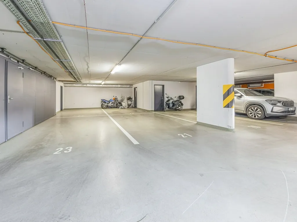 K bytu náleží dvě parkovací místa a sklad/komora 9 m² hned u parkování (praktické pro kola, kufry apod.).