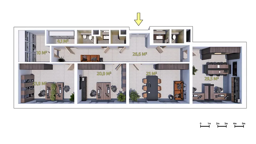 Kanceláře: Jednotky o výměrách 27,1 m², 24,0 m², 28,2 m² a 32,7 m². Všechny kanceláře jsou vybaveny kuchyňskými linkami se spotřebiči a venkovními elektrickými žaluziemi.