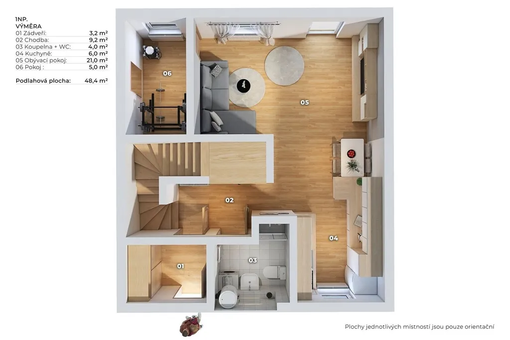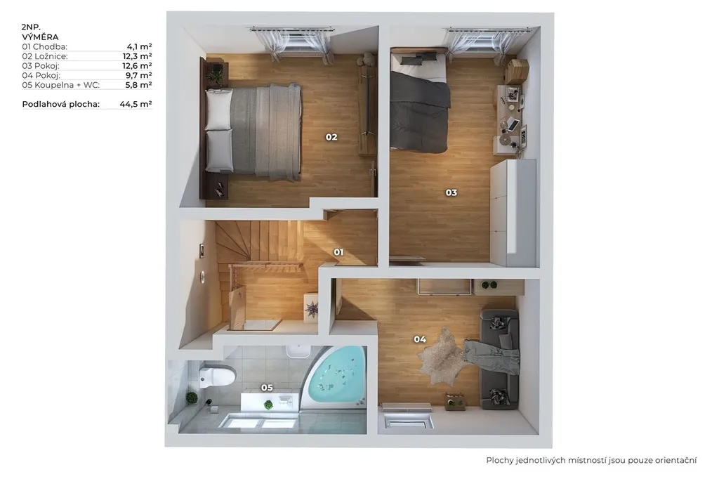 Orientace domu je na východ (pokoje a terasa) a na západ (kuchyňský kout, pokoj a koupelna). Dům sestává z přízemí, ve kterém se nachází vstupní chodba se zádveřím (12,4 m2), obývací pokoj (21 m2) se vstupem na prostornou terasu a přilehlou zahradu, dále kuchyňský kout (6 m2), pracovna (5 m2), která je v současné době využívána jako posilovna, a koupelna se sprchovým koutem a s WC (4 m2). V horním patře se nachází ložnice (12,3 m2), 2 pokoje (12,6 m2 a 9,7 m2) a prostorná koupelna s oknem, s rohovou vanou a s WC (5,8 m2).