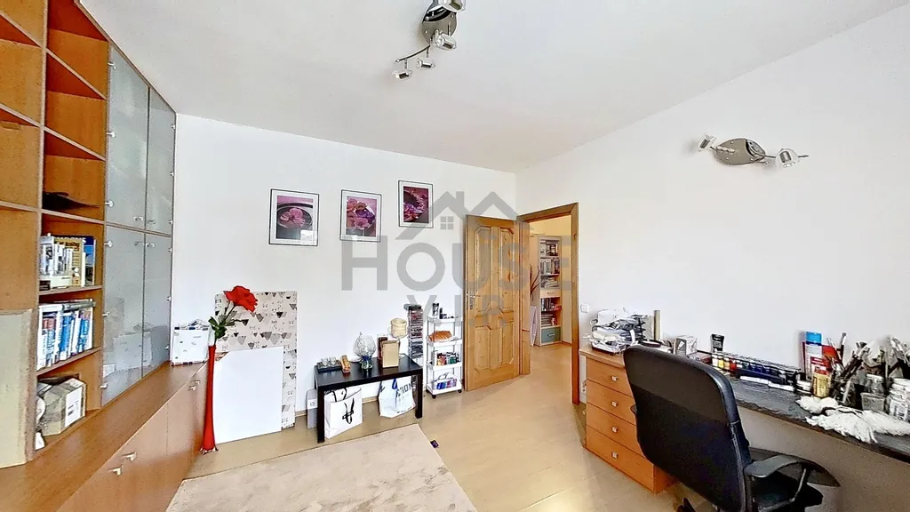 1. patro: vstupní hala, pracovna, 2 ložnice, 2 šatny, koupelna s vanou, samostatné WC.
