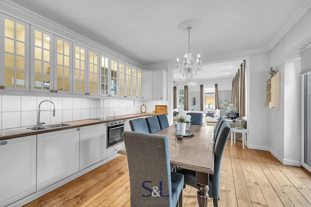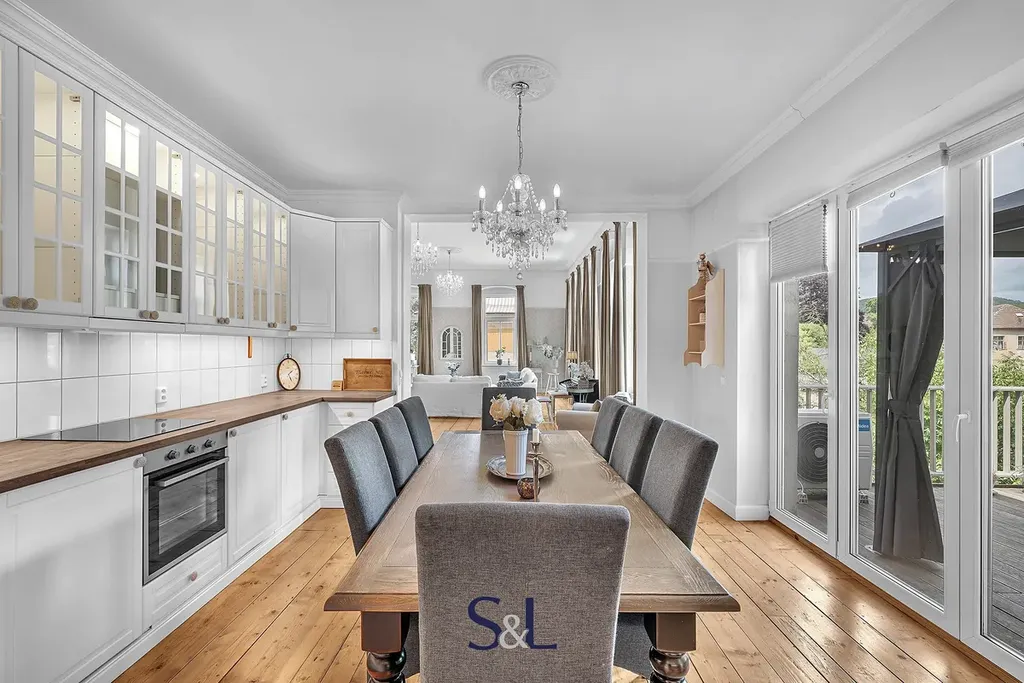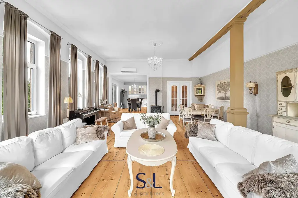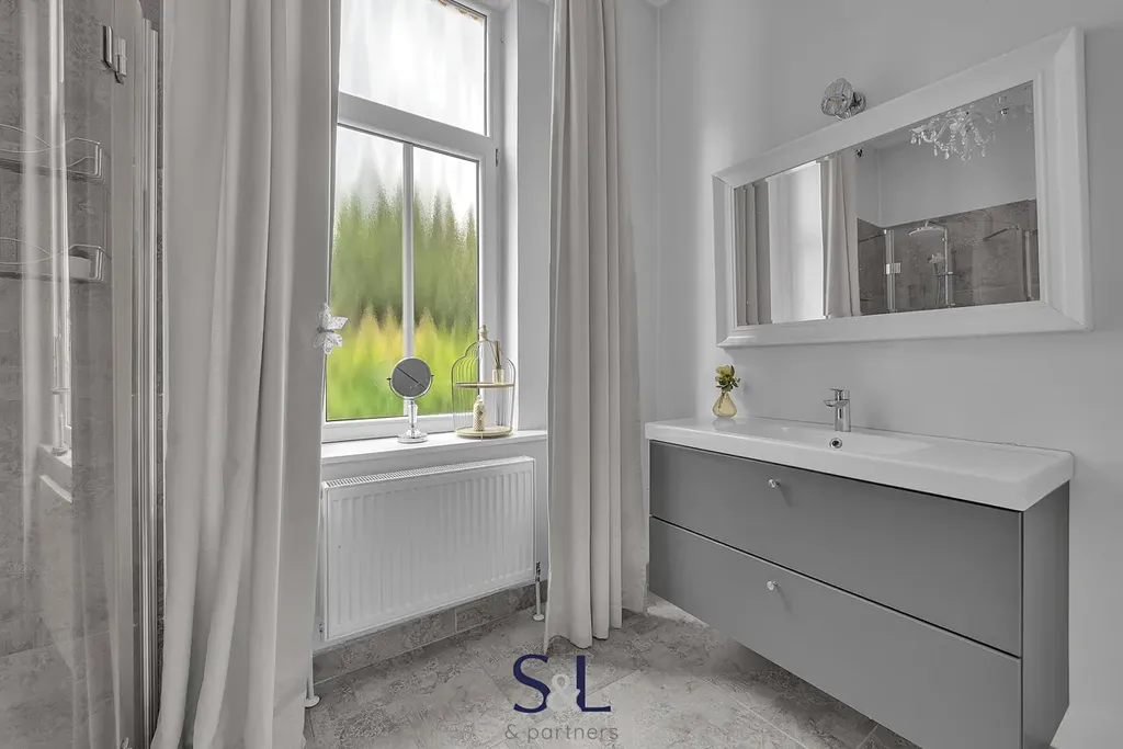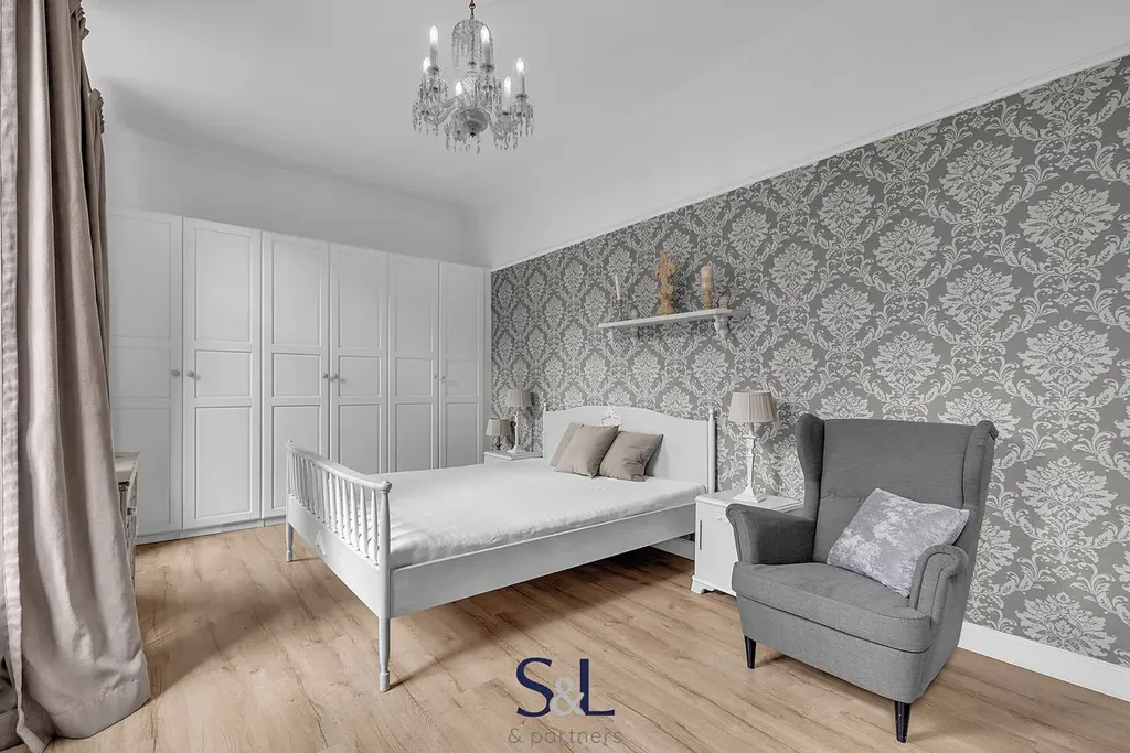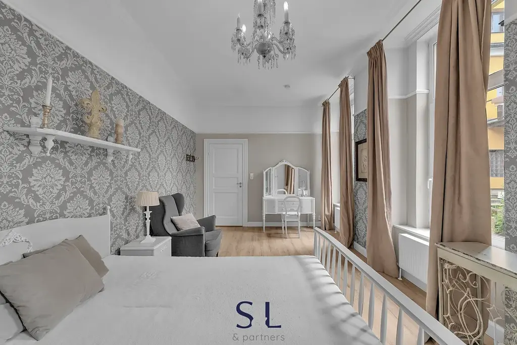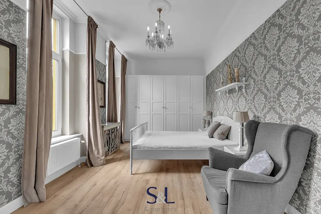 Byt je zcela nový – vše od podlah přes rozvody až po klimatizaci s tepelným čerpadlem (možnost v zimě levně topit) v obývacím pokoji. Původní smrkové podlahy, vysoké stropy, stylové lustry, jemně vzorované tapety a citlivý výběr barev vytváří harmonický prostor s nádechem francouzského venkova.