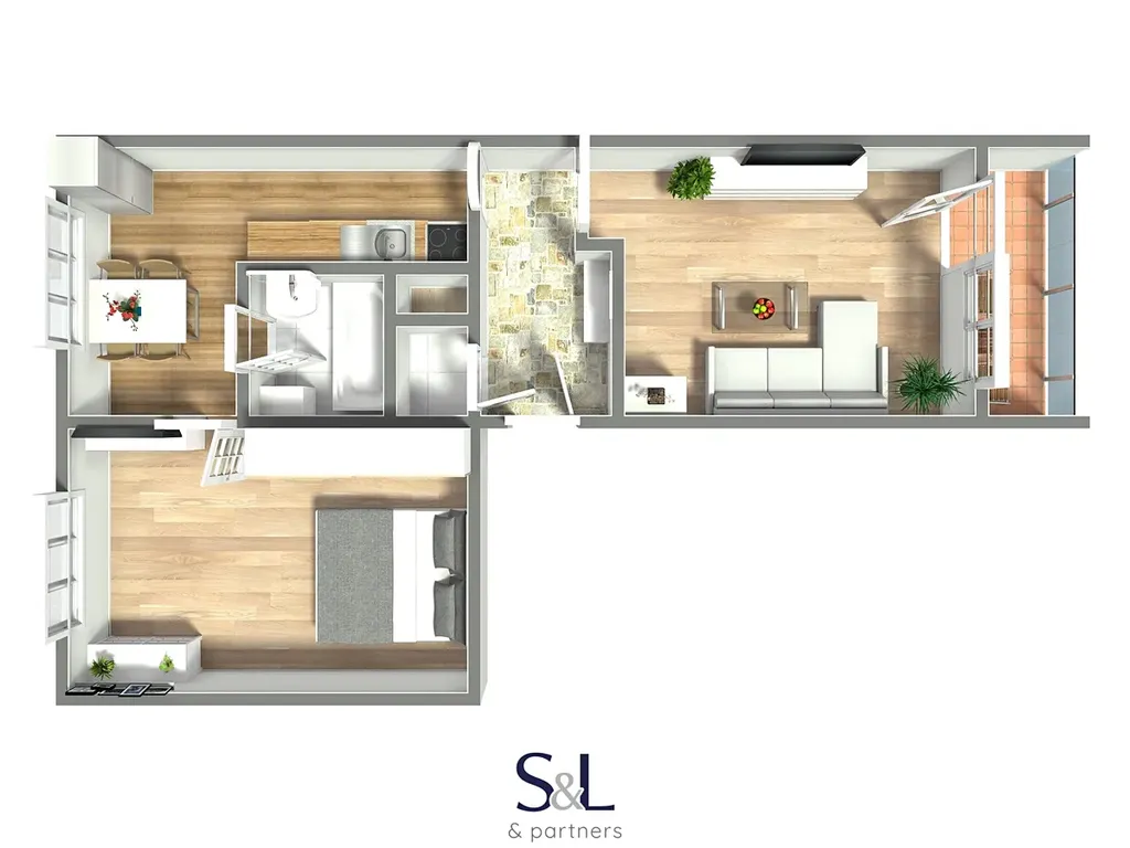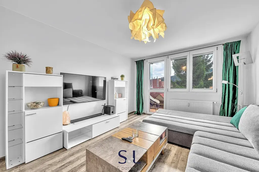 Byt o celkové ploše 55 m² je ideální volbou pro jednotlivce, pár nebo mladou rodinu. Vše je připraveno k okamžitému nastěhování – kuchyň je plně vybavená včetně spotřebičů, v koupelně najdete vanu i pračku, WC je samostatné. Byt má dva neprůchozí pokoje, přičemž z jednoho z nich je přímý vstup na lodžii s posezením. K bytu náleží také sklep o velikosti 3 m².