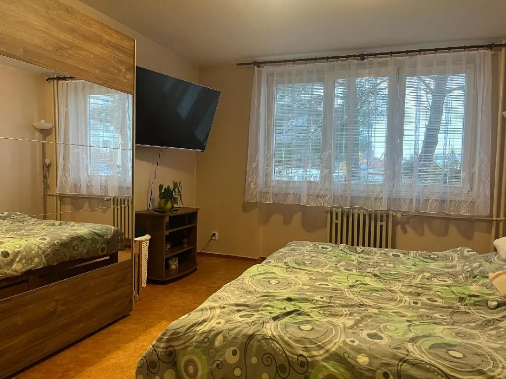 Byt se nachází ve zvýšeném přízemí bez výtahu s výhledem do zeleně a je členěn na vstupní chodbu, samostatnou toaletu, koupelnu se sprchovým koutem, obývací pokoj, dvě ložnice, kuchyň a balkon. Pokoje jsou neprůchozí. Prostorný zděný sklep se nachází v suterénu, balkon je zasklen. Byla zde provedena kompletní rekonstrukce, nová elektroinstalace, zděné jádro, dveře, podlahy, nová omítka, sádrokartonové stropy aj. Dům prošel revitalizací, je zateplen, okna jsou plastová.