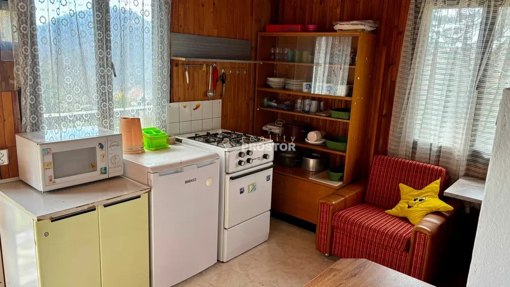 Do patra je vstup po schodech na balkon a rovněž do chaty. Přízemí chaty slouží jako obývací část, je zde i menší zázemí na vaření včetně plynového sporáku a krb.