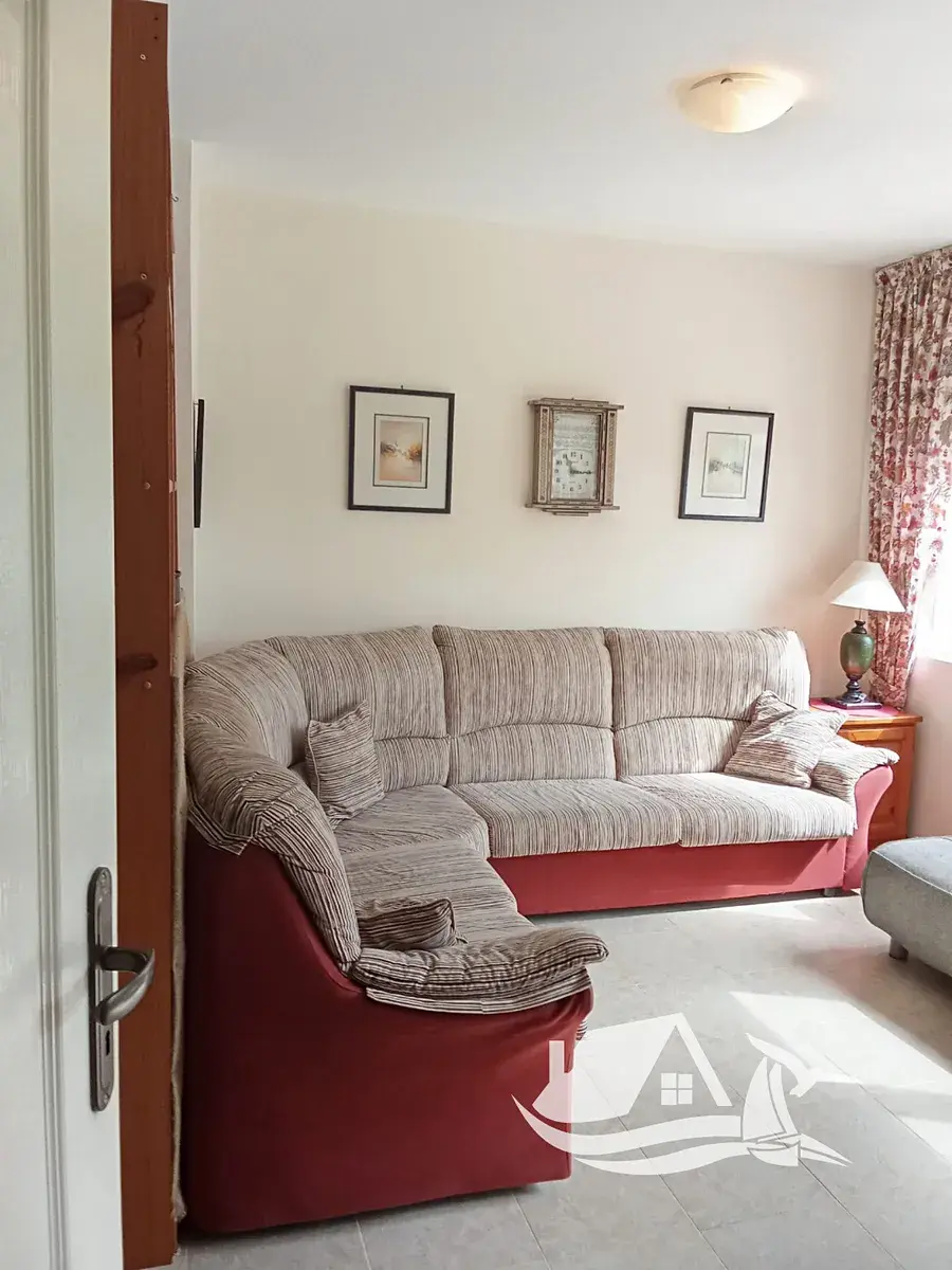 Dispozice: vstupní chodba, obývací pokoj s kuchyňským koutem, ložnice, koupelna s toaletou, balkon s výhledem na bazén