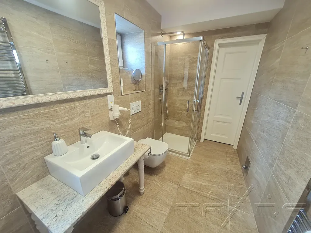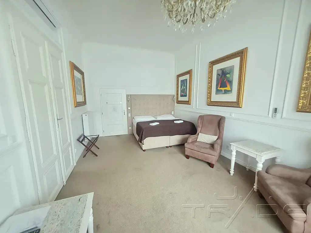 Celý apartmán o skladebnosti 40 ms vybavenou kuchyní, obývacím pokojem a samostatnou ložnicí, koupelnou s vanou i sprchovým koutema WC, výhledem do vnitřního dvora, klimatizací, TV s plochou obrazovkou, zvukovou izolací.