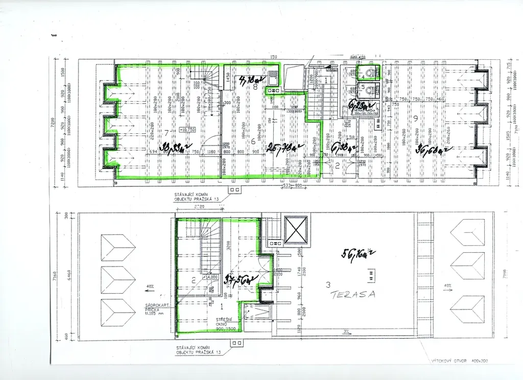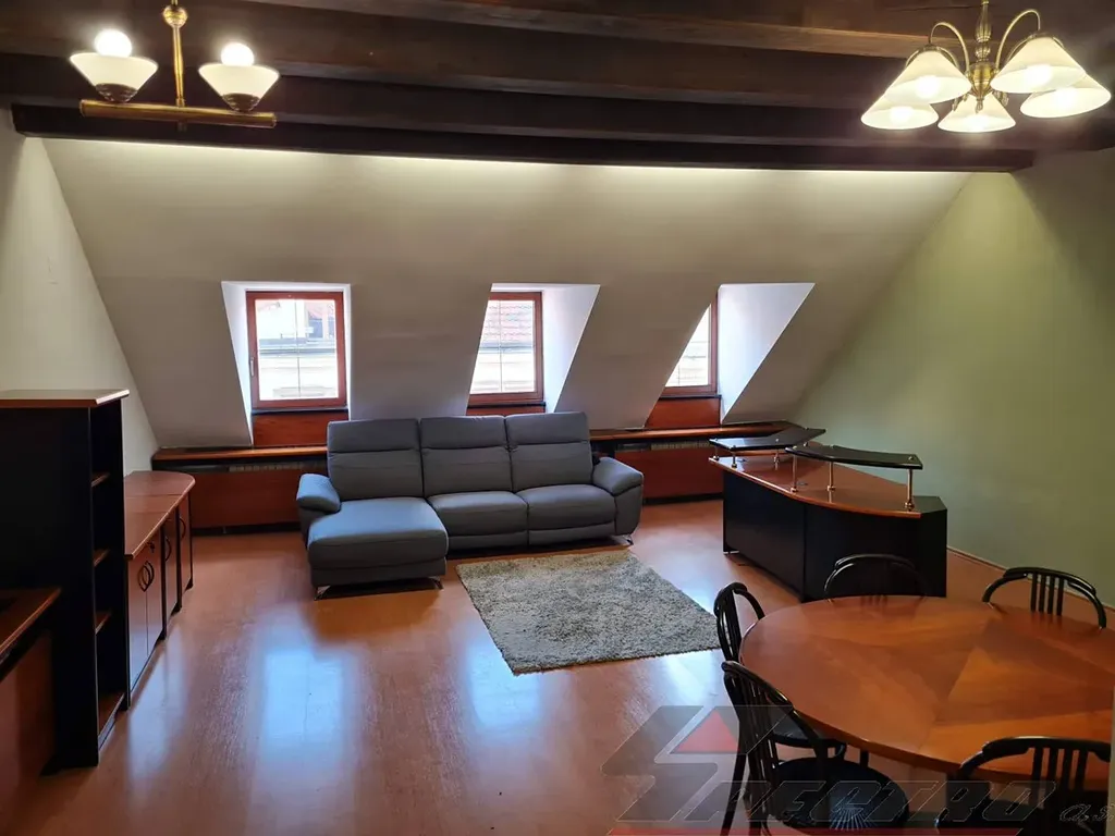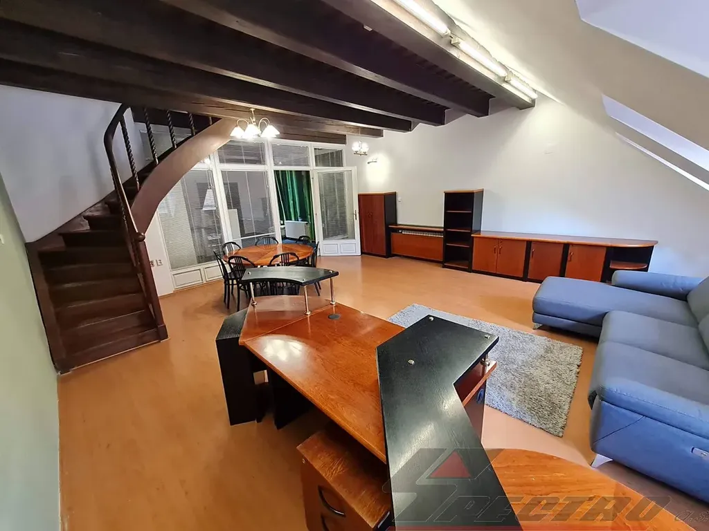 Nabízíme k pronájmu velmi reprezentativní luxusní nebytové prostory přímo v centru Plzně, Pražská ul. Nachází se v renesančním domě u nám. Republiky v podkroví ve 3.patře. Jedná se o 2 kanceláře s mezonetem o celk. výměře 102 m2 + terasa, vlastní kuchyňka a WC. Z předsíňky se vchází do místnosti o rozloze 25,78 m2 (recepce, sekretariát), z té je vstup do kuchyňky (4,18 m2) a prosklenými dveřmi se vejde do rozlehlé místnosti o vel. 38,33 m2, ze které vede dřevěné schodiště do mezonetového prostoru o vel. 37,56 m2, z něhož přístup na terasu o vel. 56 m2. Samostatná toaleta se nachází na vstupní chodbě. Vše vyznačeno na přiloženém nákresu - zeleně označené plochy. Nábytek lze v případě zájmu odstranit. Prostory mají vlastní zabezpečovací zařízení. Nájemné: 14.700 Kč. Energie a služby: 4.000 Kč (EE, topení, voda, úklid společných prostor a odvoz odpadků). Kauce 20.000 Kč. Provize 1 nájemné. Volné ihned.