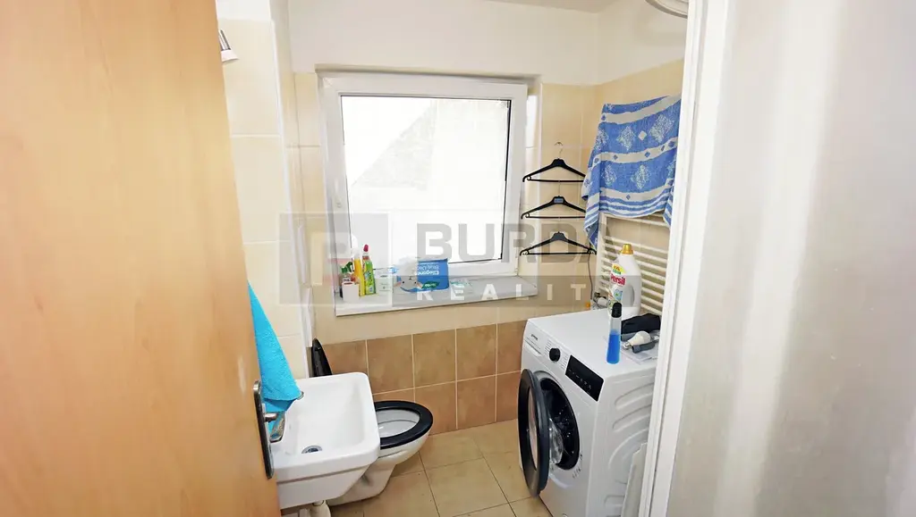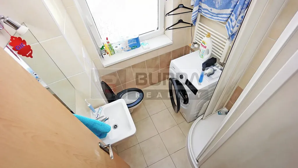 Byt se skládá z chodby, koupelny, obývacího pokoje s kuchyňským koutem a oddělené ložnice. Koupelna je vybavena sprchovým koutem, WC, umyvadlem, zrcadlem, topným žebříkem a přípojkami pro pračku. Pračka v bytě nezůstane, ani žádné spotřebiče v kuchyni.