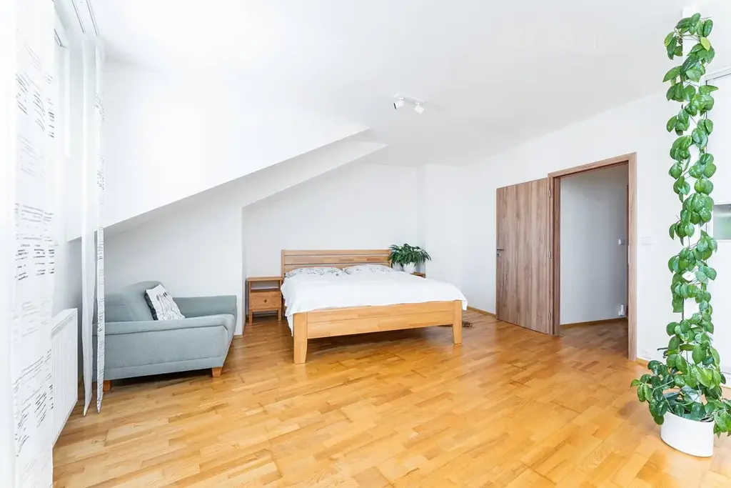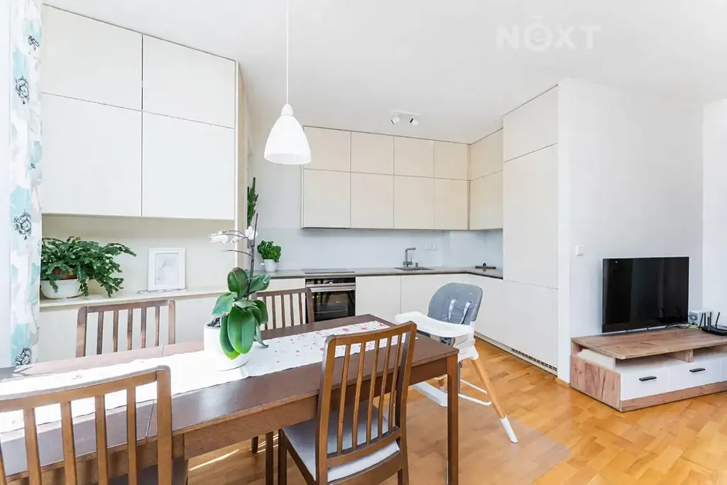 Byt je velmi pěkně zařízen, má dřevěné podlahy, kuchyň na míru s kamennou deskou.