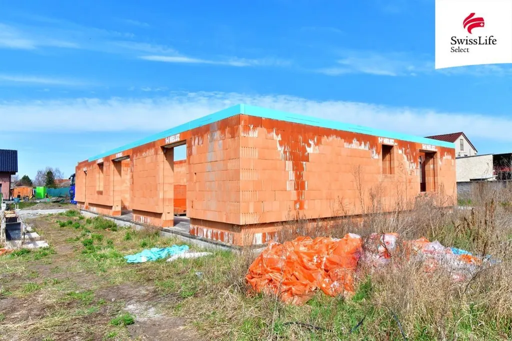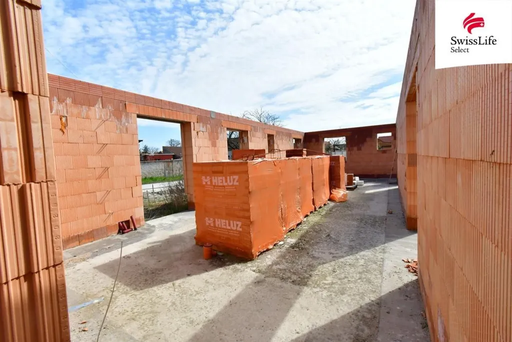 Na pozemku je již hotová základová deska a obvodové zdivo po věnec a několik palet stavebního materiálu.