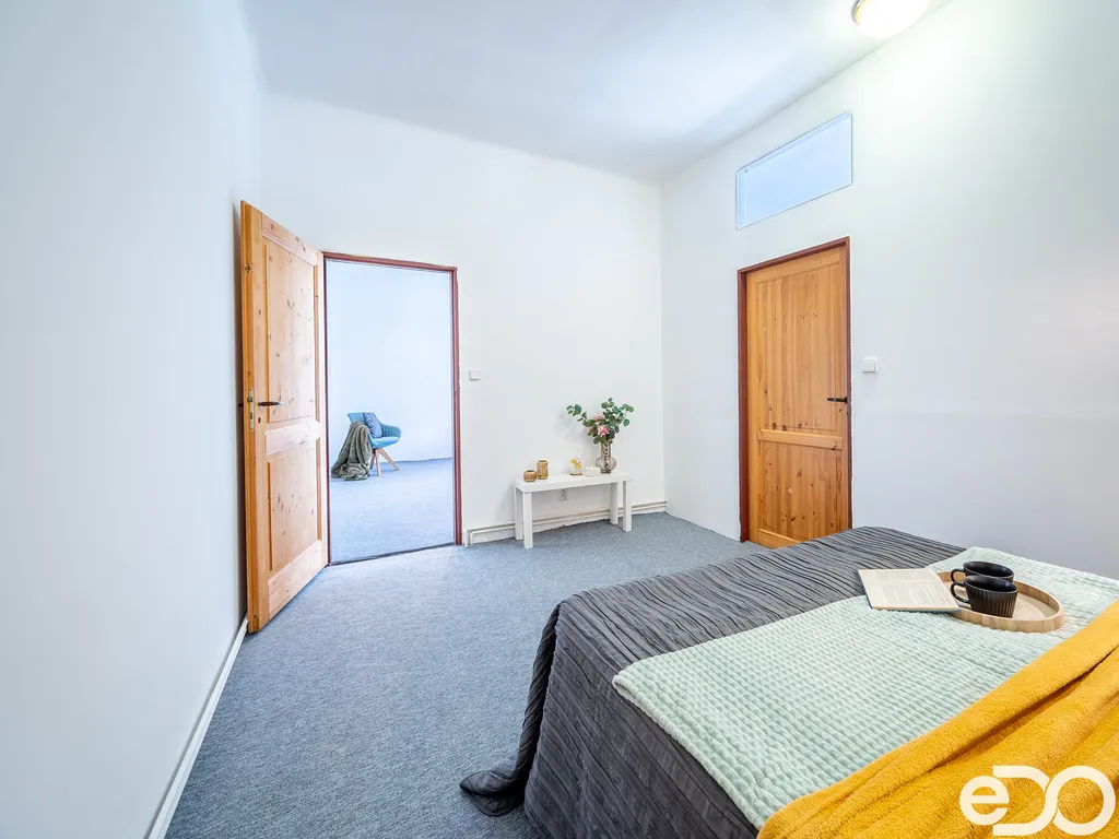Díky celkové výměře byt poskytuje nadstandardní prostor v rámci dispozice 2+1. Kuchyně je samostatná a navazuje na centrální chodbu, která propojuje jednotlivé části bytu.