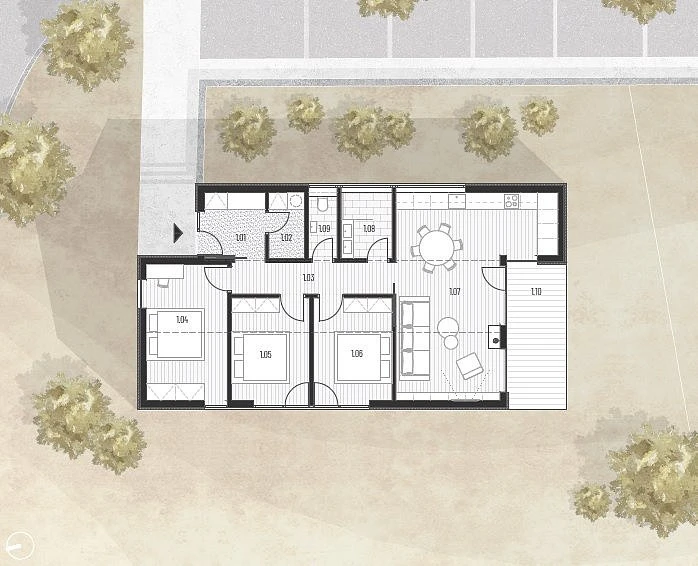 Interiér domu je promyšlený do posledního detailu: Hned při vstupu vás přivítá zádveří, které nabízí prostor pro pohodlné přezutí i uložení svršků. Navazuje technická místnost vhodná pro domácí spotřebiče a úklidové potřeby.
