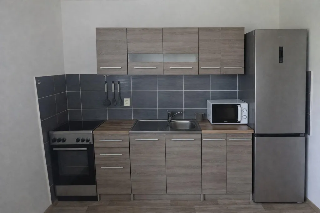 V jednom z pokojů se nachází kuchyňská linka s elektrickými kamny. V koupelně je bojler pro ohřev vody, přípojka na pračku, umyvadlo, prostorná vana a WC. Celá koupelna je obložena vkusnými obklady. Fotografie upraveny bez osobních věcí nájemníka. Byt bude pronajímán bez zařízení.